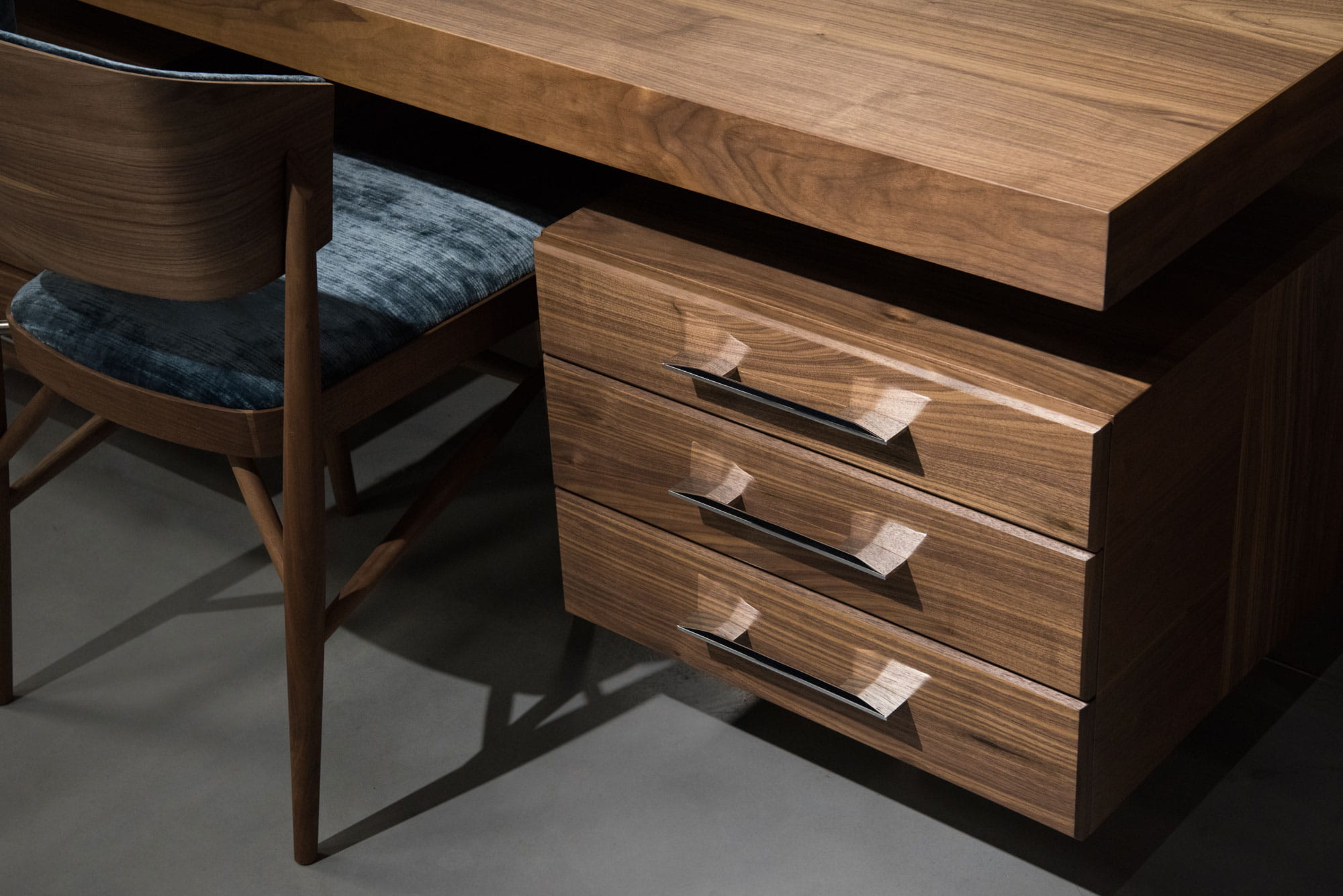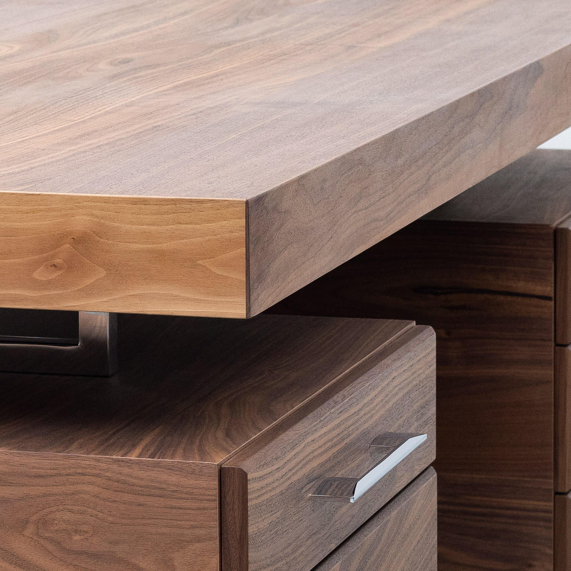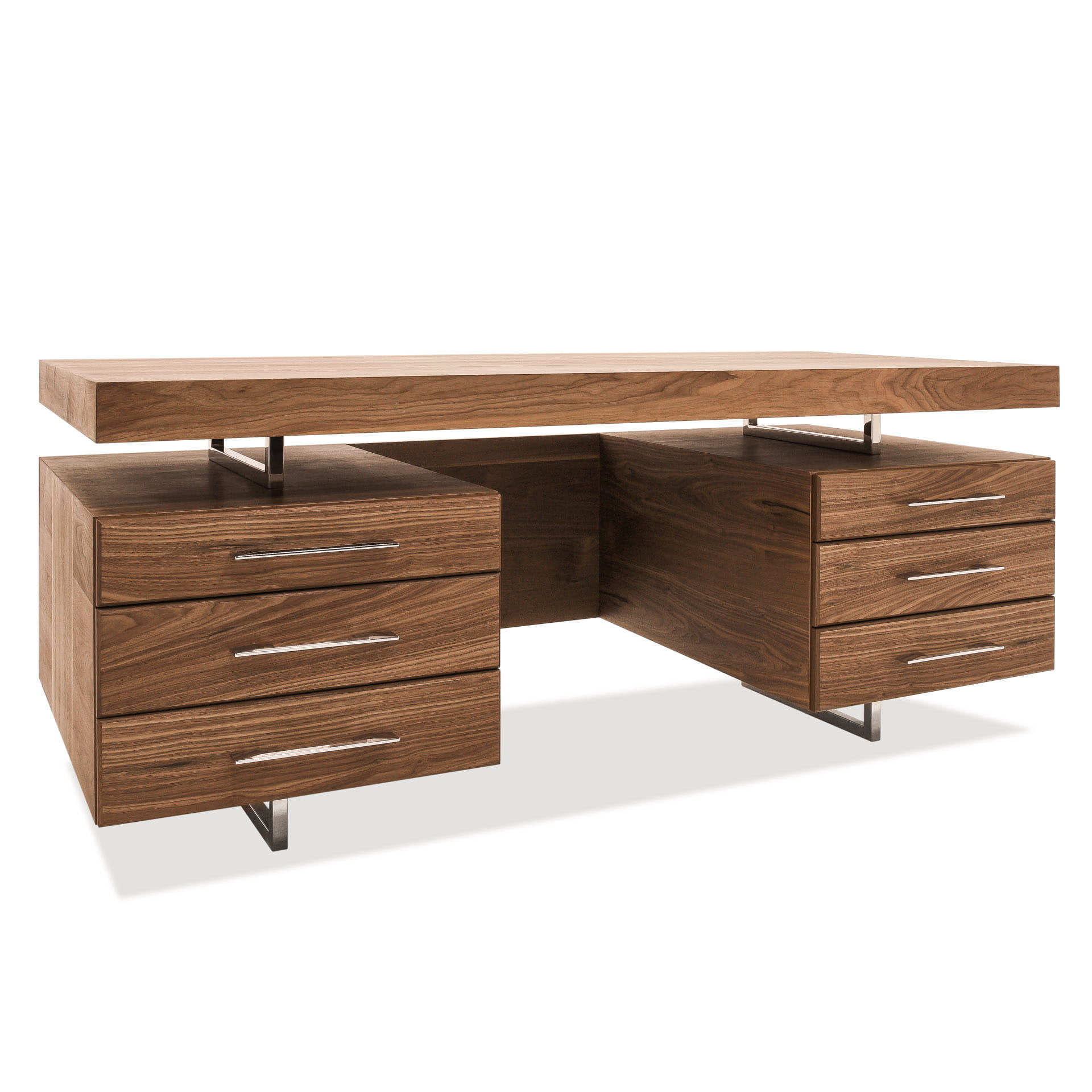 Masywne biurko z dużym blatem, wykonane z naturalnego drewna orzechowego w połączeniu z chromowanymi elementami.