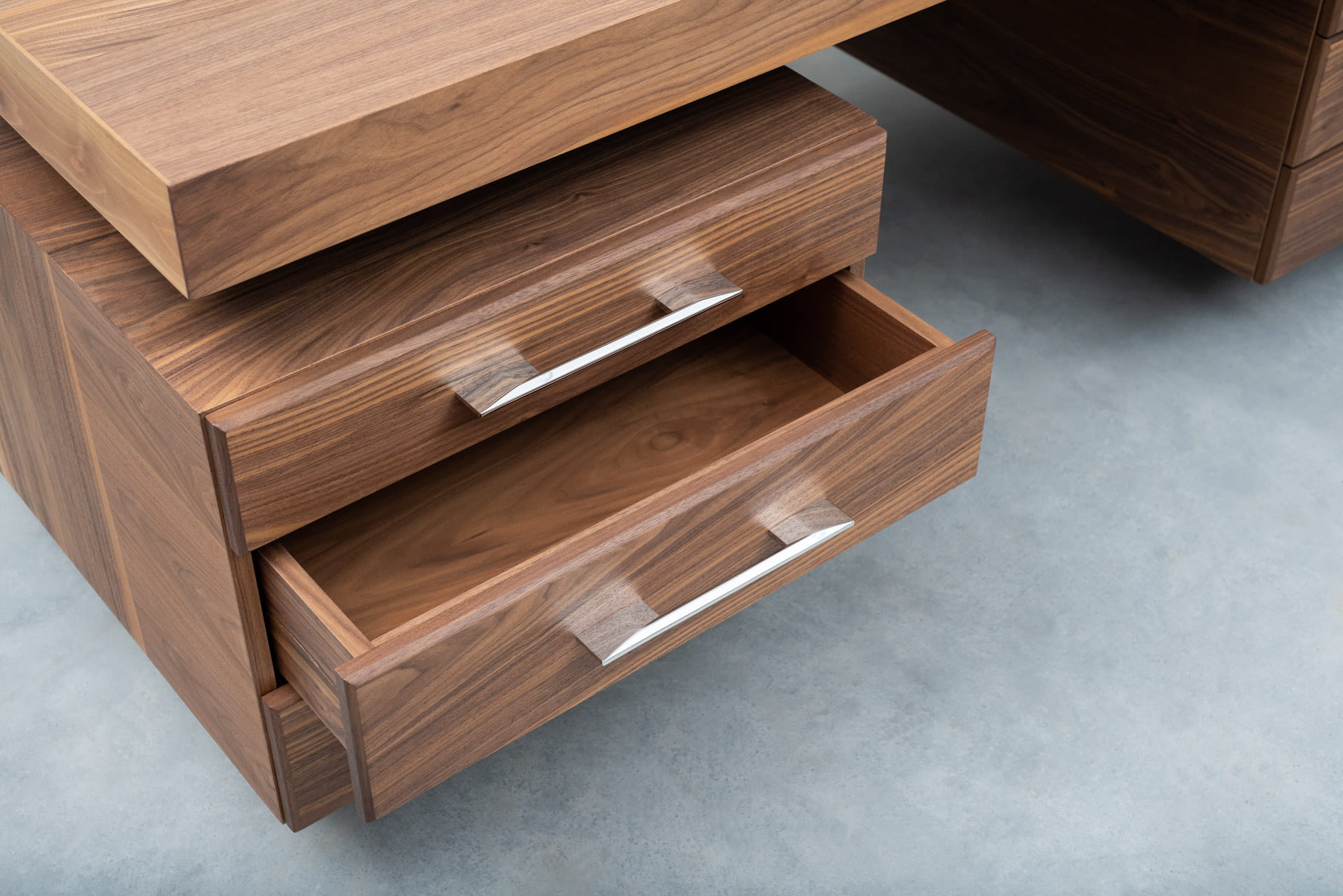 Pomiędzy blatem a szufladami pozostawiono przestrzeń z uwzględnieniem chromowanych elementów powtarzających się również w podstawie mebla. Dzięki temu mebel ma optycznie lżejszą, a nadal solidną konstrukcję.