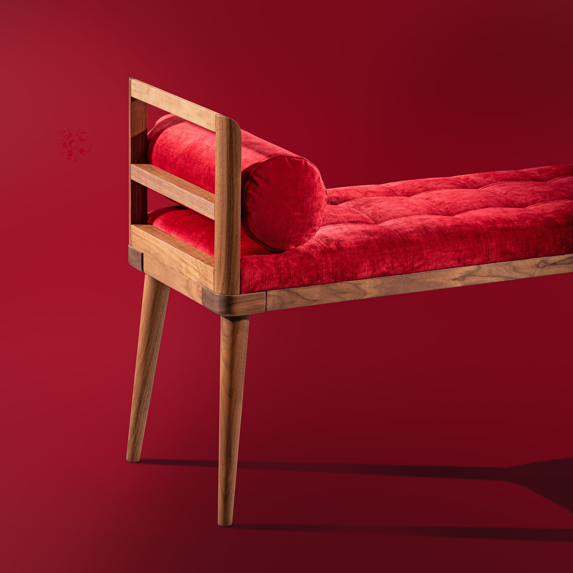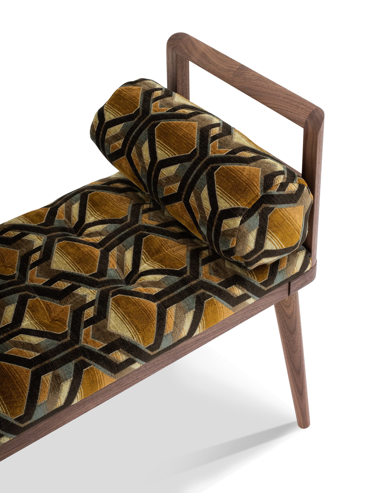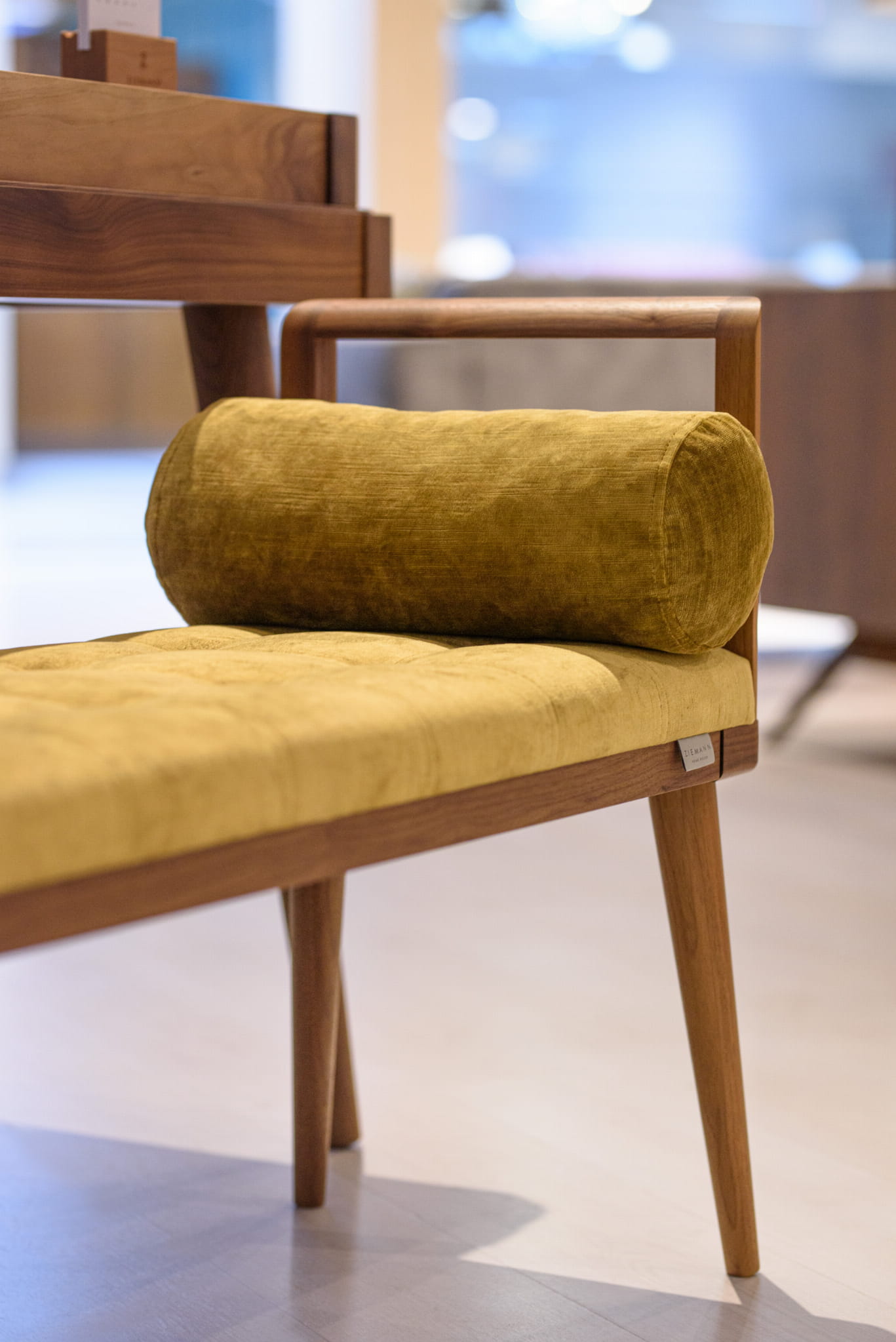 Tapicerowana ławka z drewnianymi występami w stylistyce mebli skandynawskich z lekko ukośnymi, stożkowymi nogami z litego drewna.