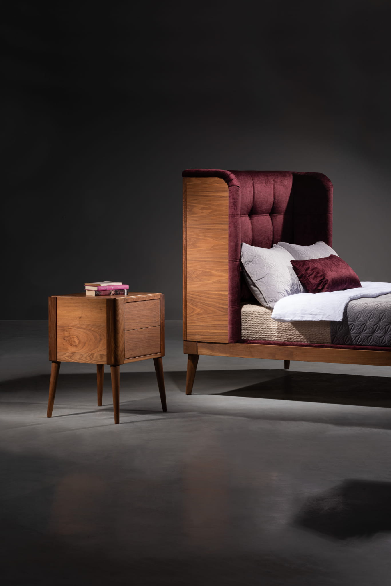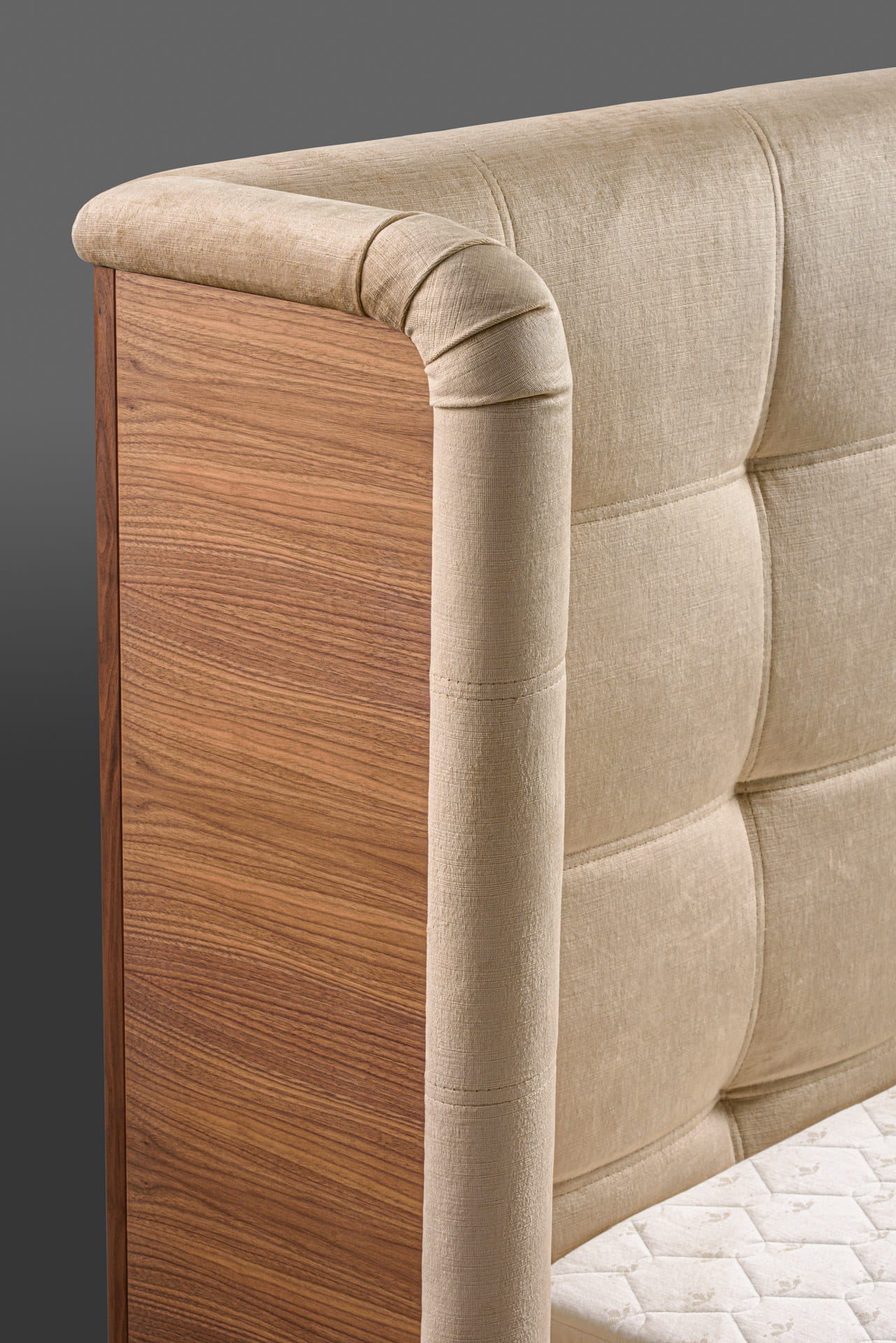 Wyjątkowy, wysoki tapicerowany zagłówek z dekoracyjnym pikowaniem i przeszyciami od wewnętrznej strony. Zewnętrzna część zagłówka wykonana jest w całości z drewna.