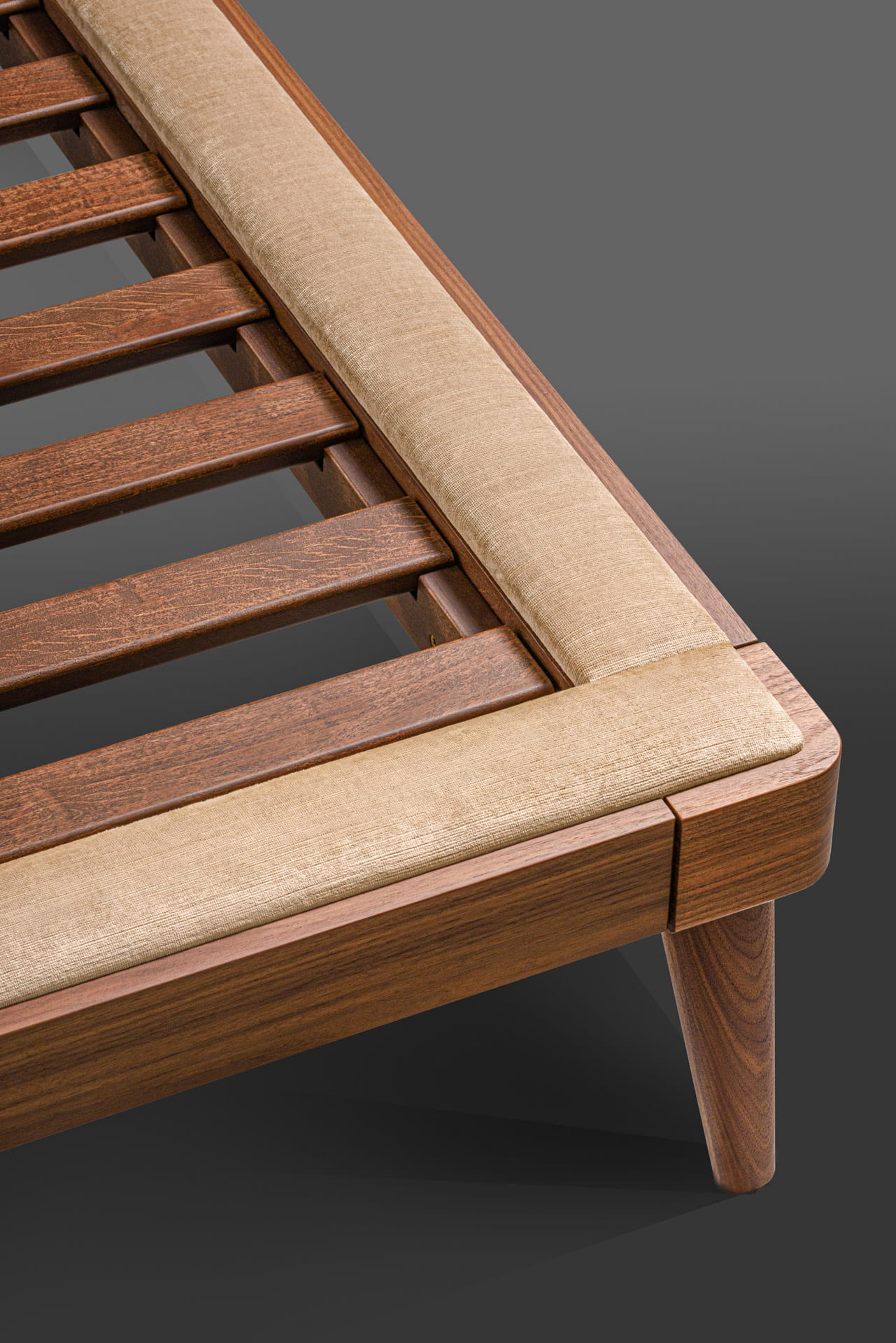 Efektowne, drewniane łóżko w stylu skandynawskim, z lekko ukośnymi, stożkowymi nogami.