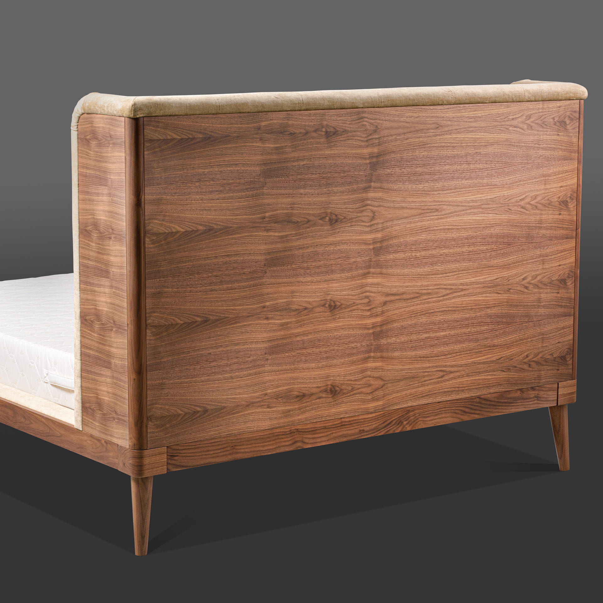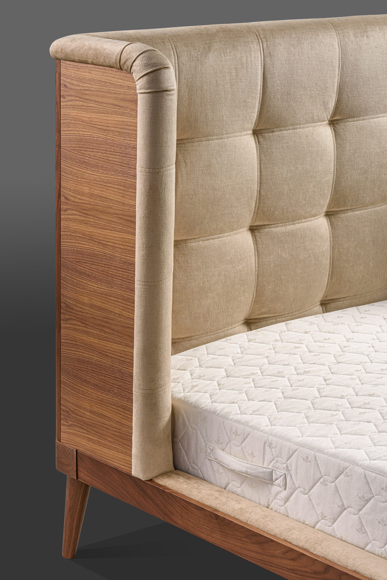 Wyjątkowy, wysoki tapicerowany zagłówek z dekoracyjnym pikowaniem i przeszyciami od wewnętrznej strony. Zewnętrzna część zagłówka wykonana jest w całości z drewna.