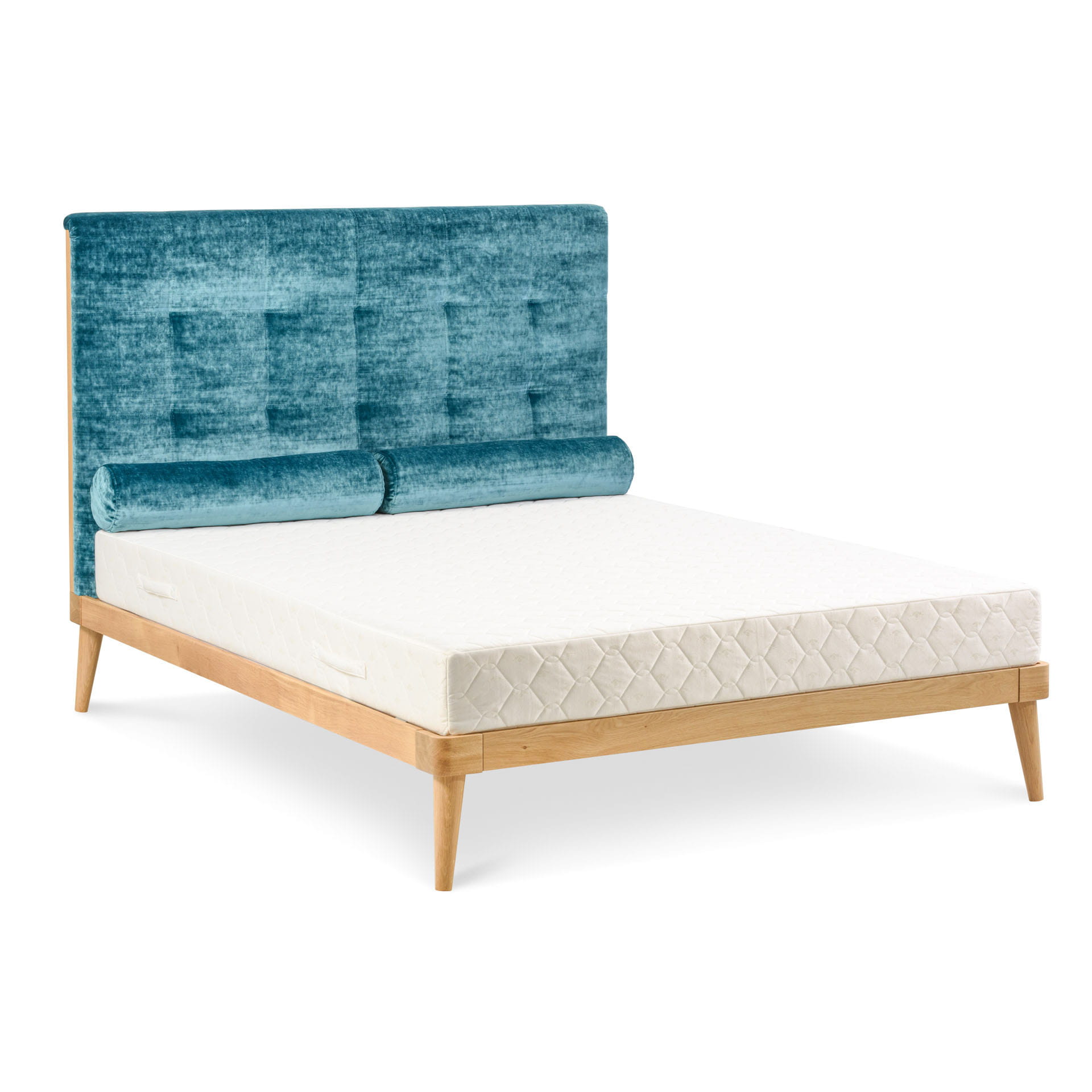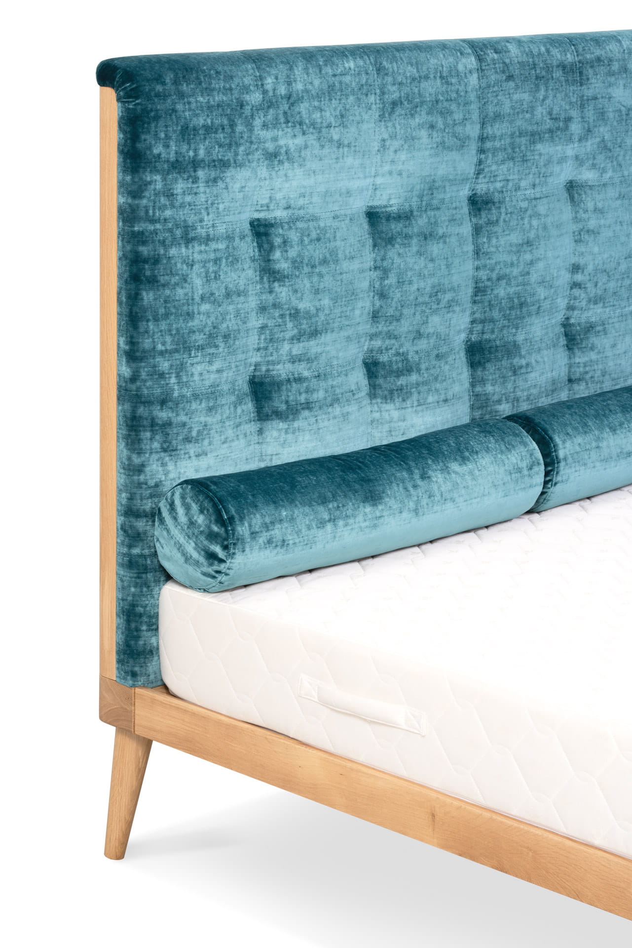 Wyjątkowy, wysoki tapicerowany zagłówek z dekoracyjnym pikowaniem i przeszyciami od wewnętrznej strony. Zewnętrzna część zagłówka wykonana jest w całości z drewna.