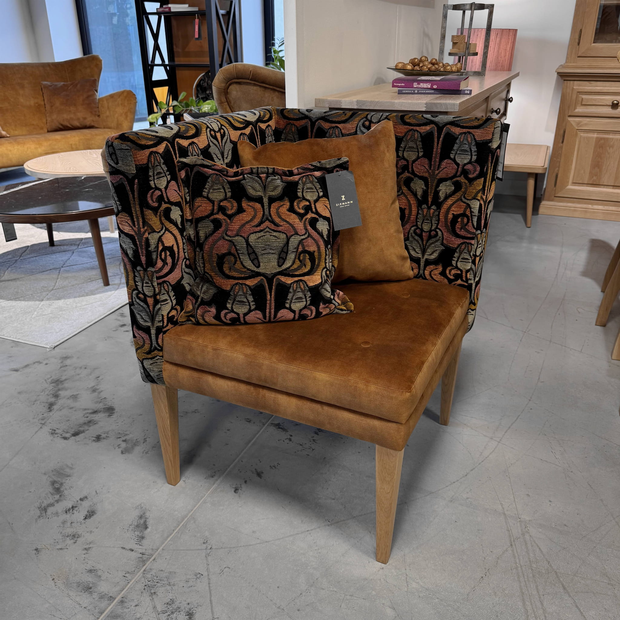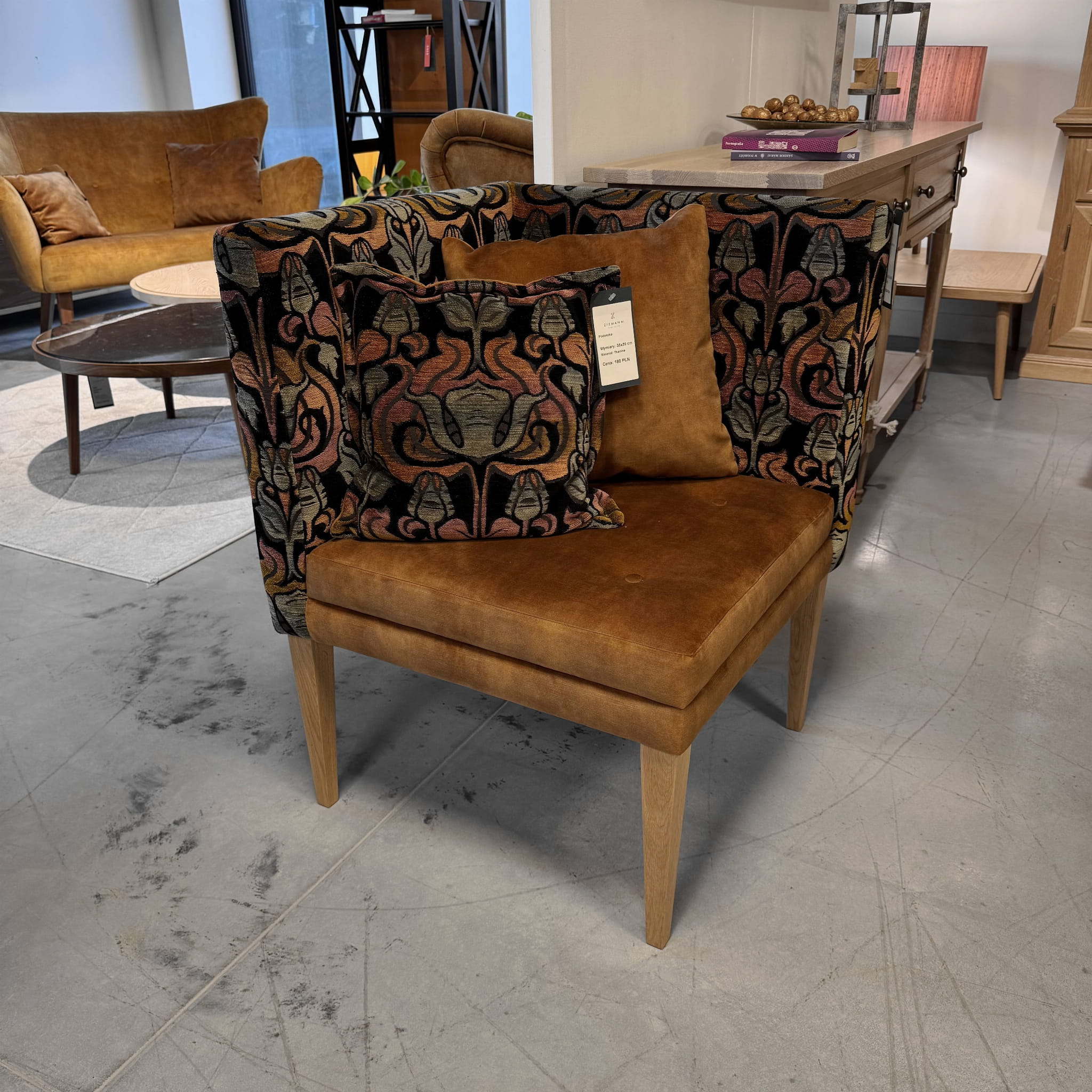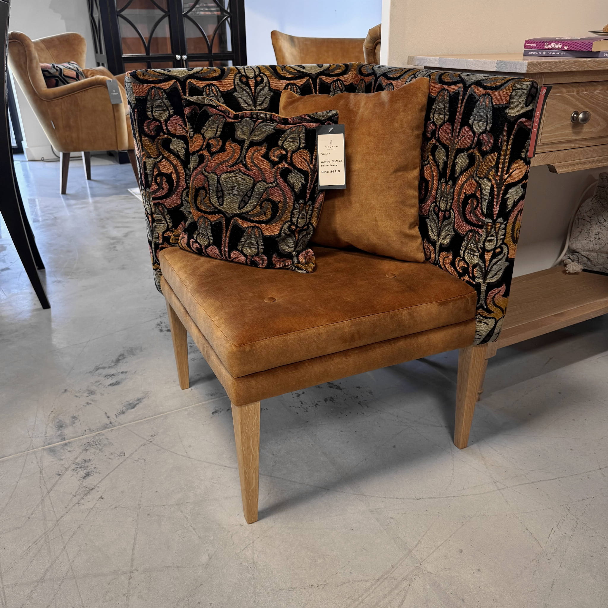 Narożne krzesło z drewnianymi nogami w orzechowym wybarwieniu.