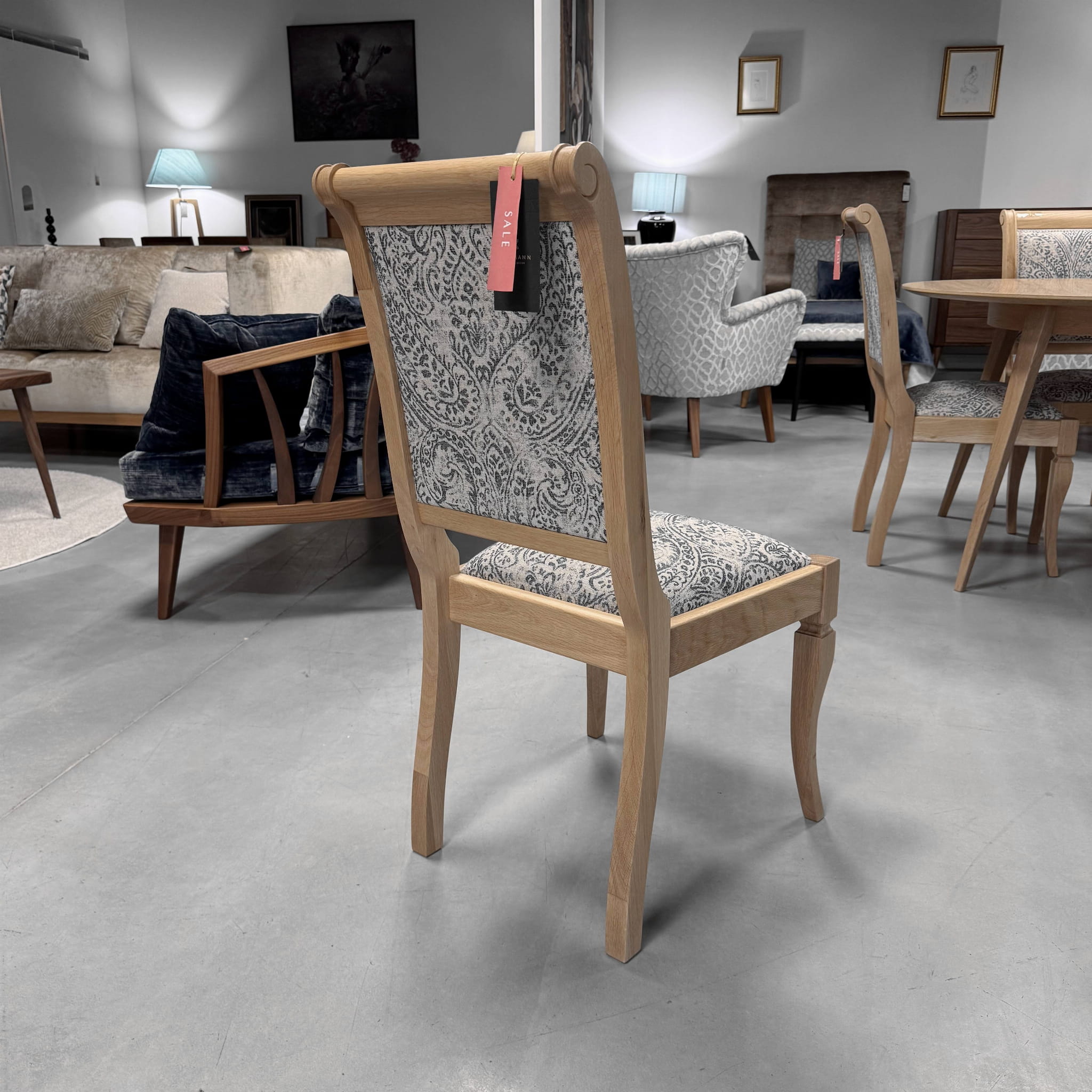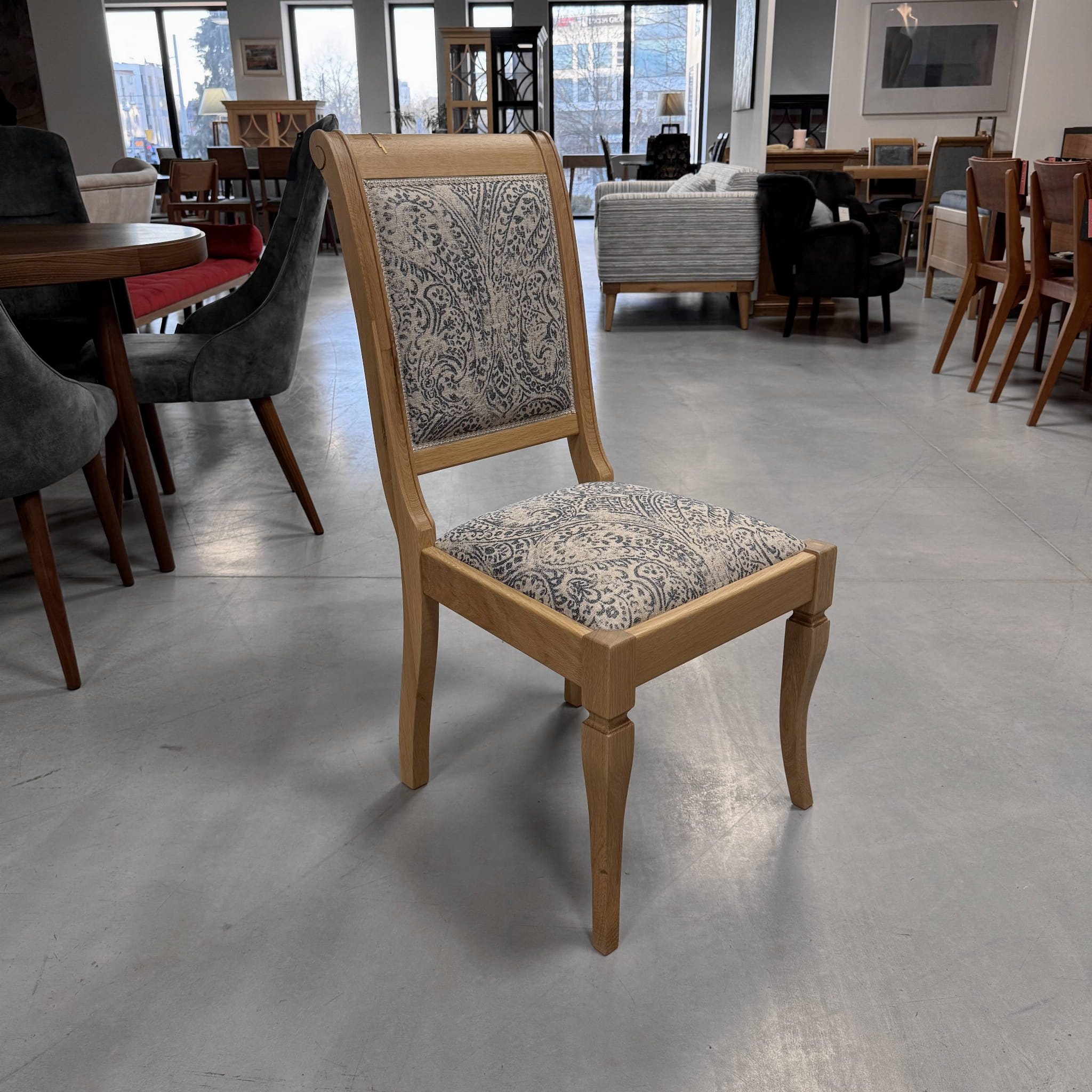 Klasyczne krzesło z tapicerowanym siedziskiem i oparciem. Lekko wygięte do tylu oparcie z delikatnym frezowanym dekorem.