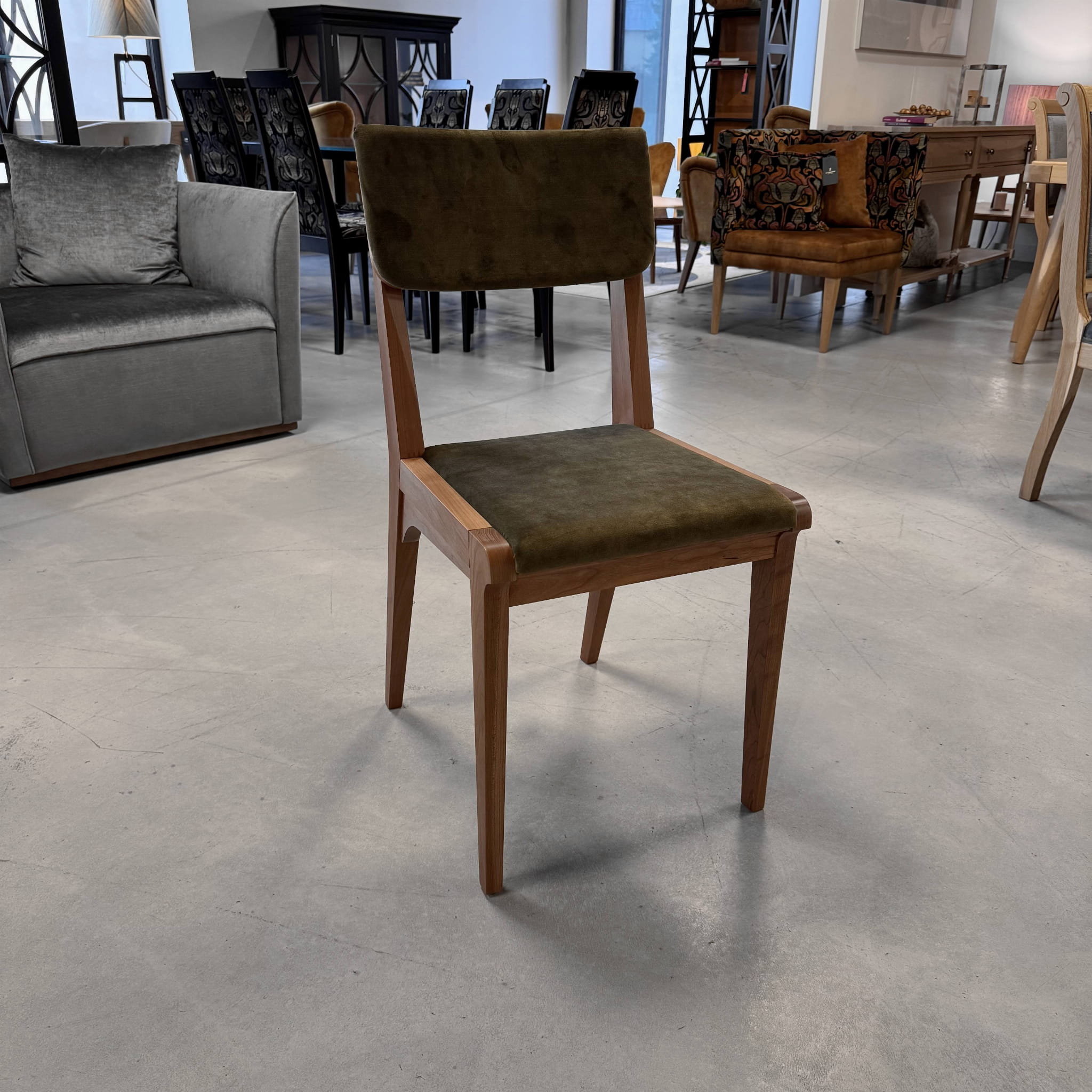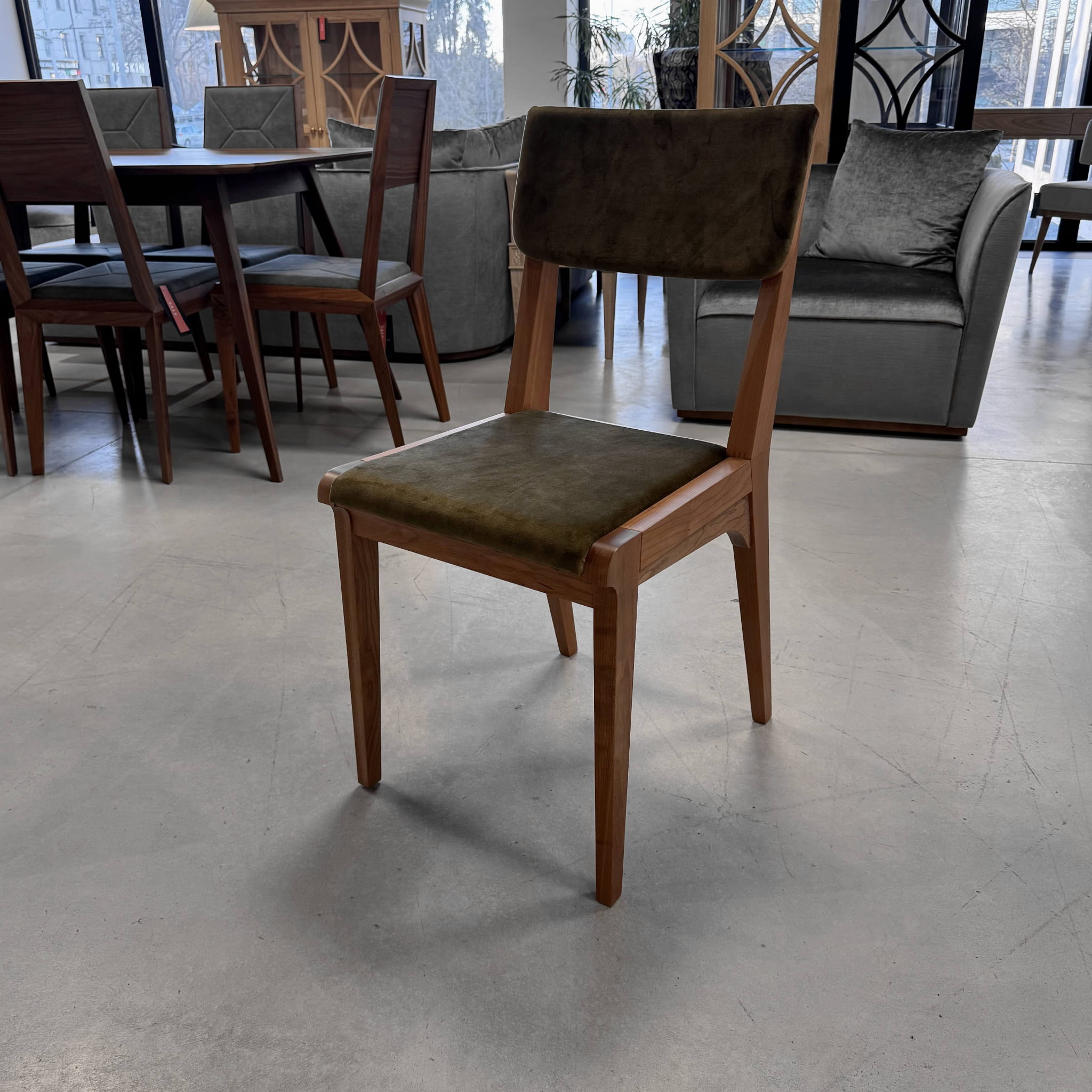 Minimalistyczne krzesło z tapicerowanym siedziskiem i oparciem.