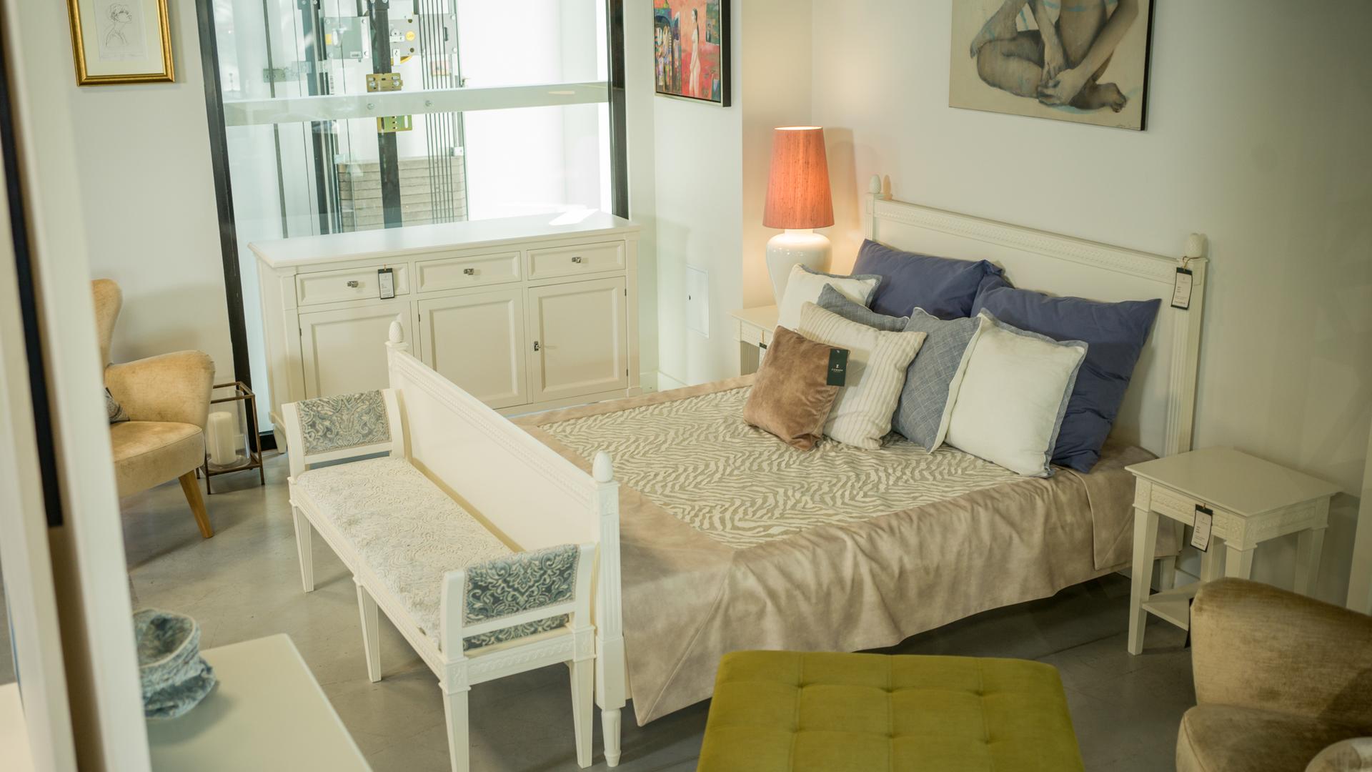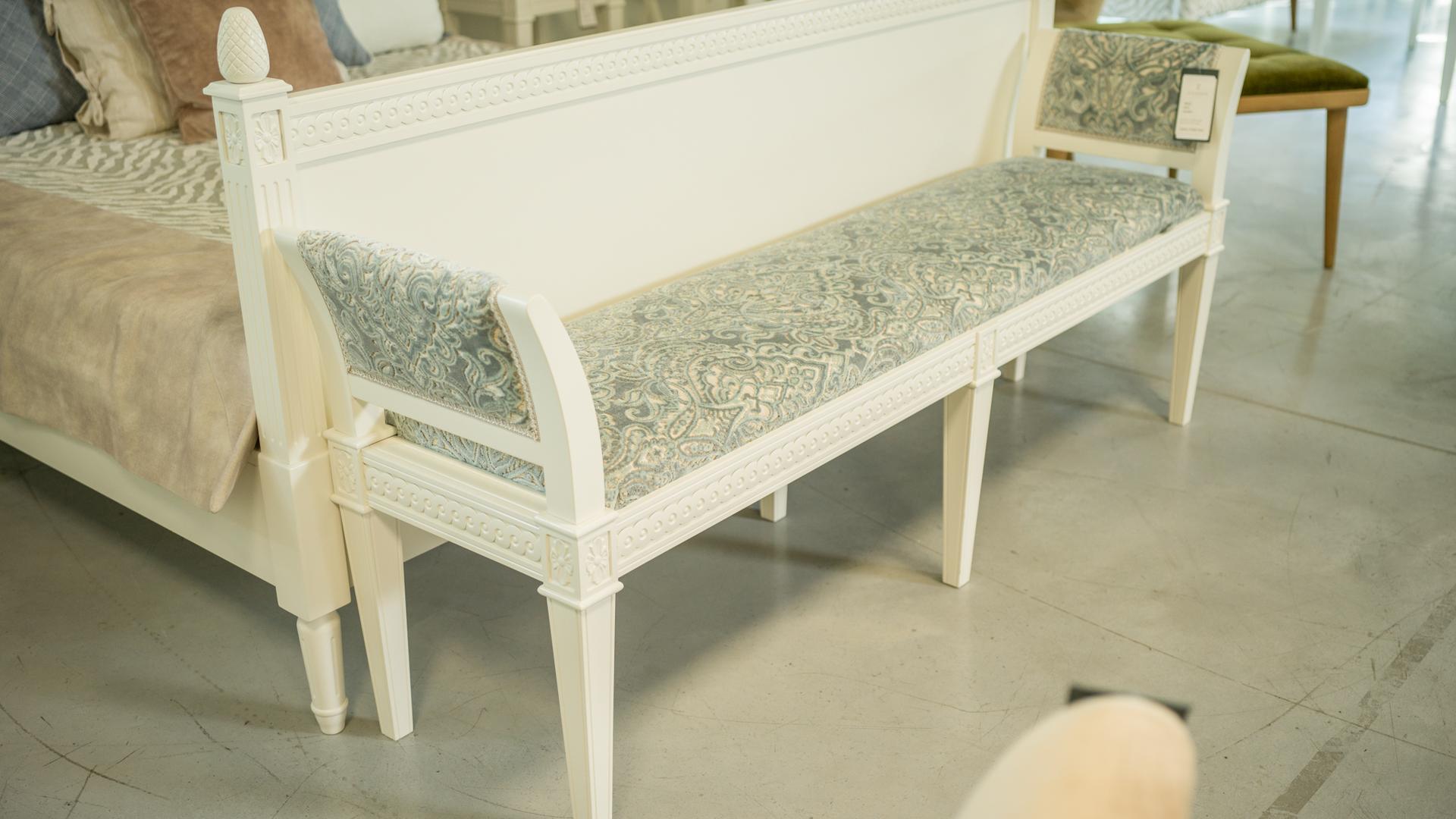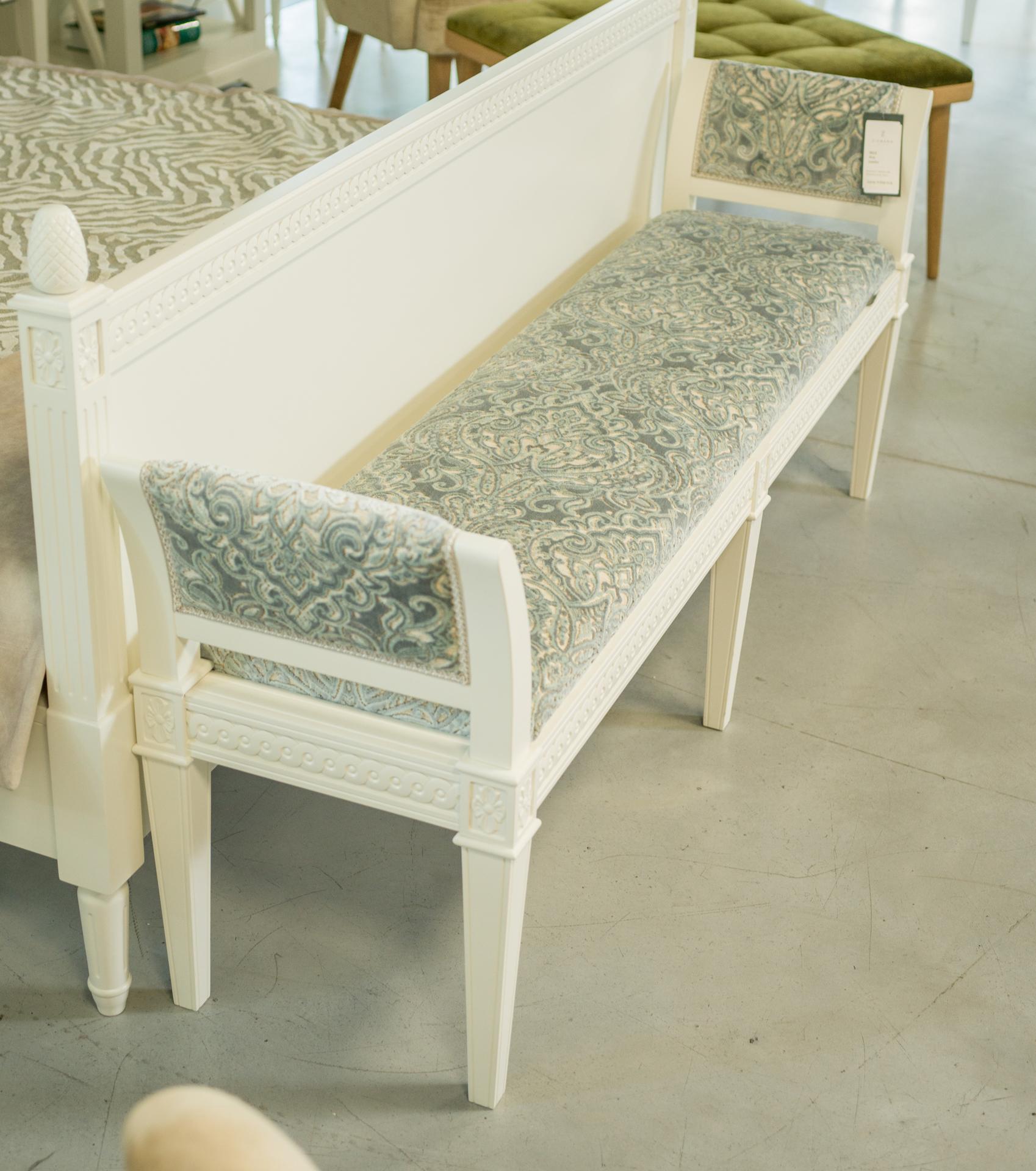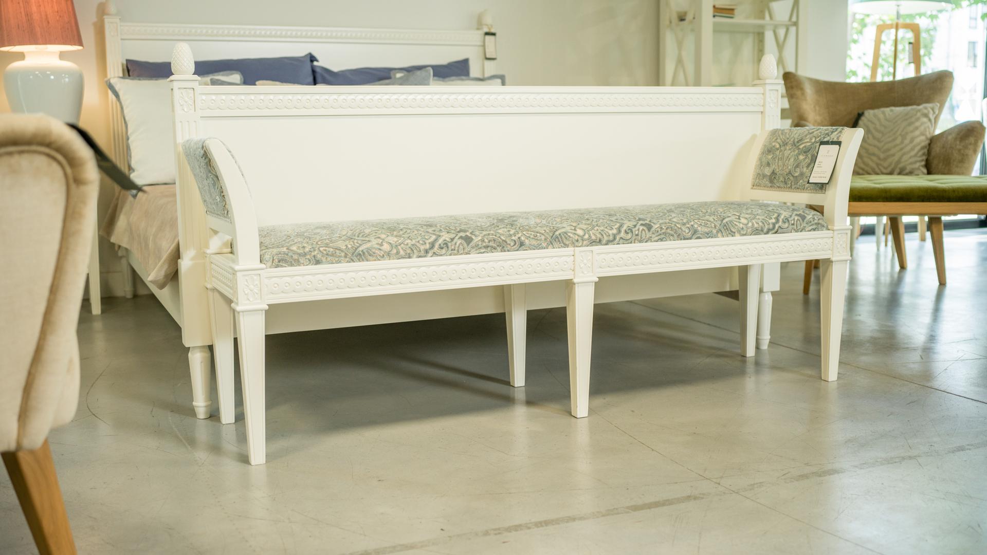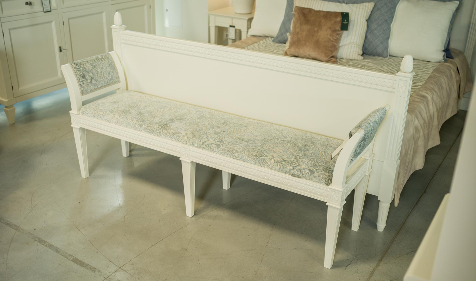 Ławka z tapicerowanym siedziskiem, z podłokietnikami lekko wygiętymi na zewnątrz wykonana z drewna lakierowanego na biało.