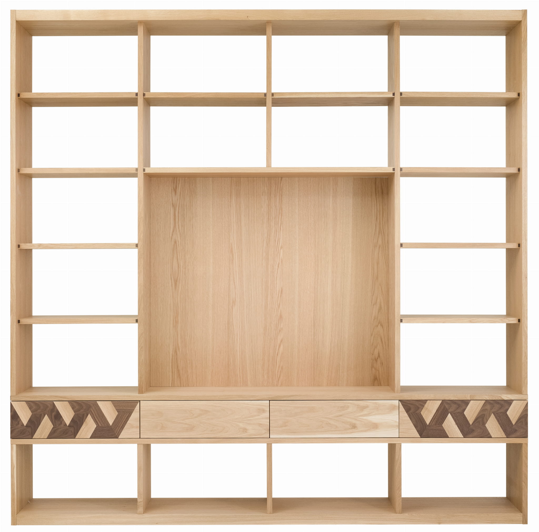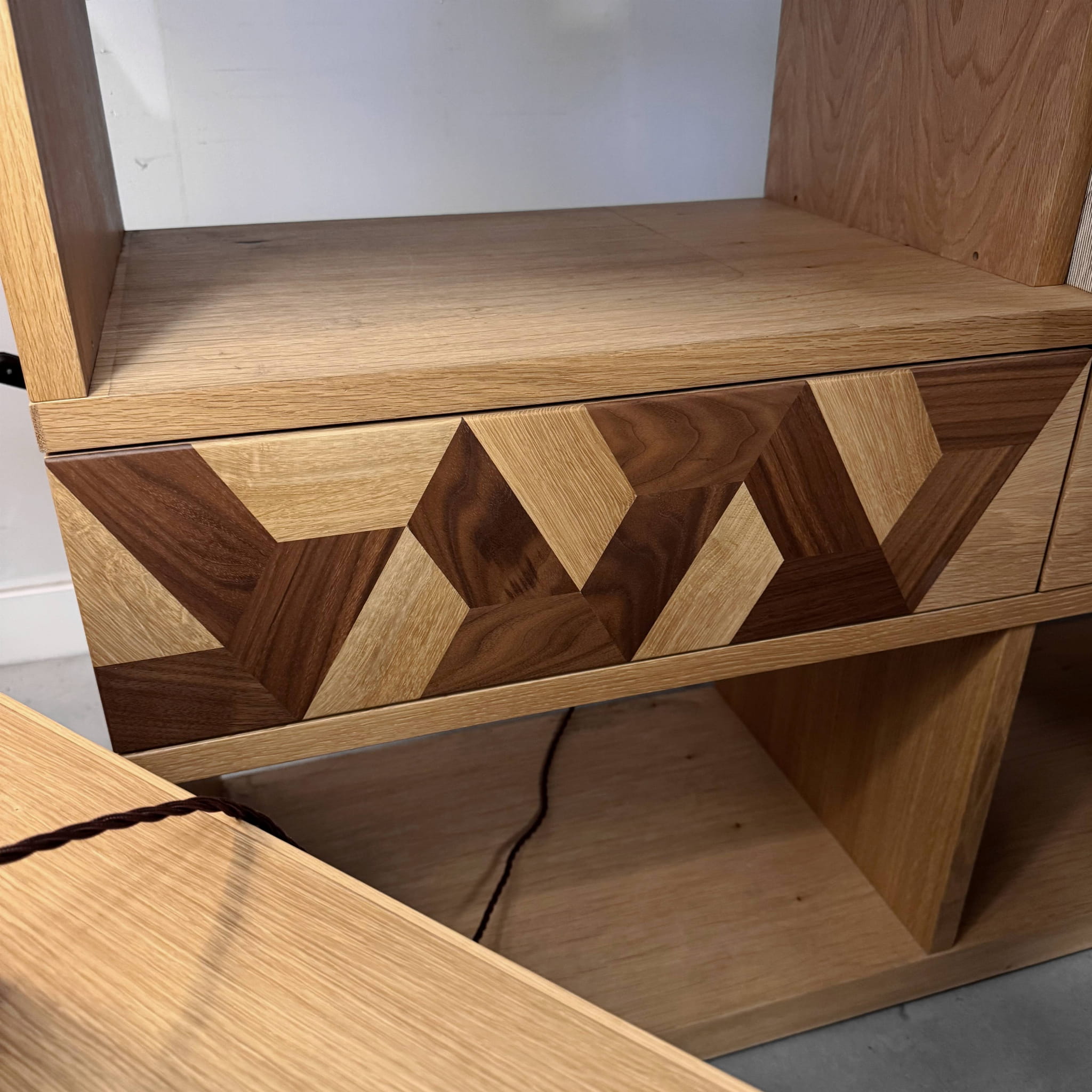 Drewniana konsola z dwiema szufladami pod blatem i półką w dolnej części mebla. Front jednej z szuflad ma charakterystyczny dekor w formie precyzyjnej, ręcznie wykonanej intarsji, która tworzy geometryczny wzór nadając ciekawego charakteru meblowi.