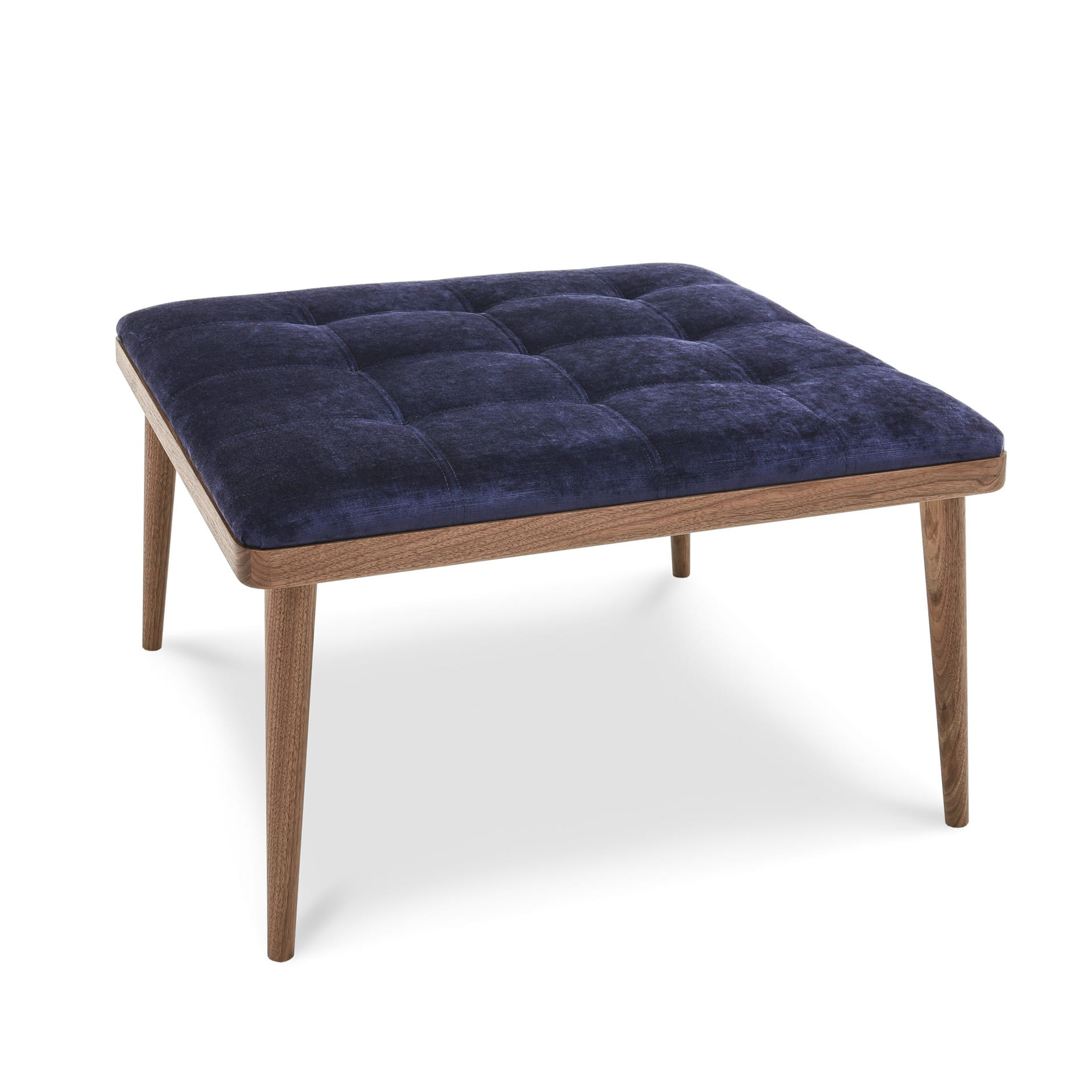 Tapicerowane siedzisko w stylistyce mebli skandynawskich z lekko ukośnymi, stożkowymi nogami z litego drewna.