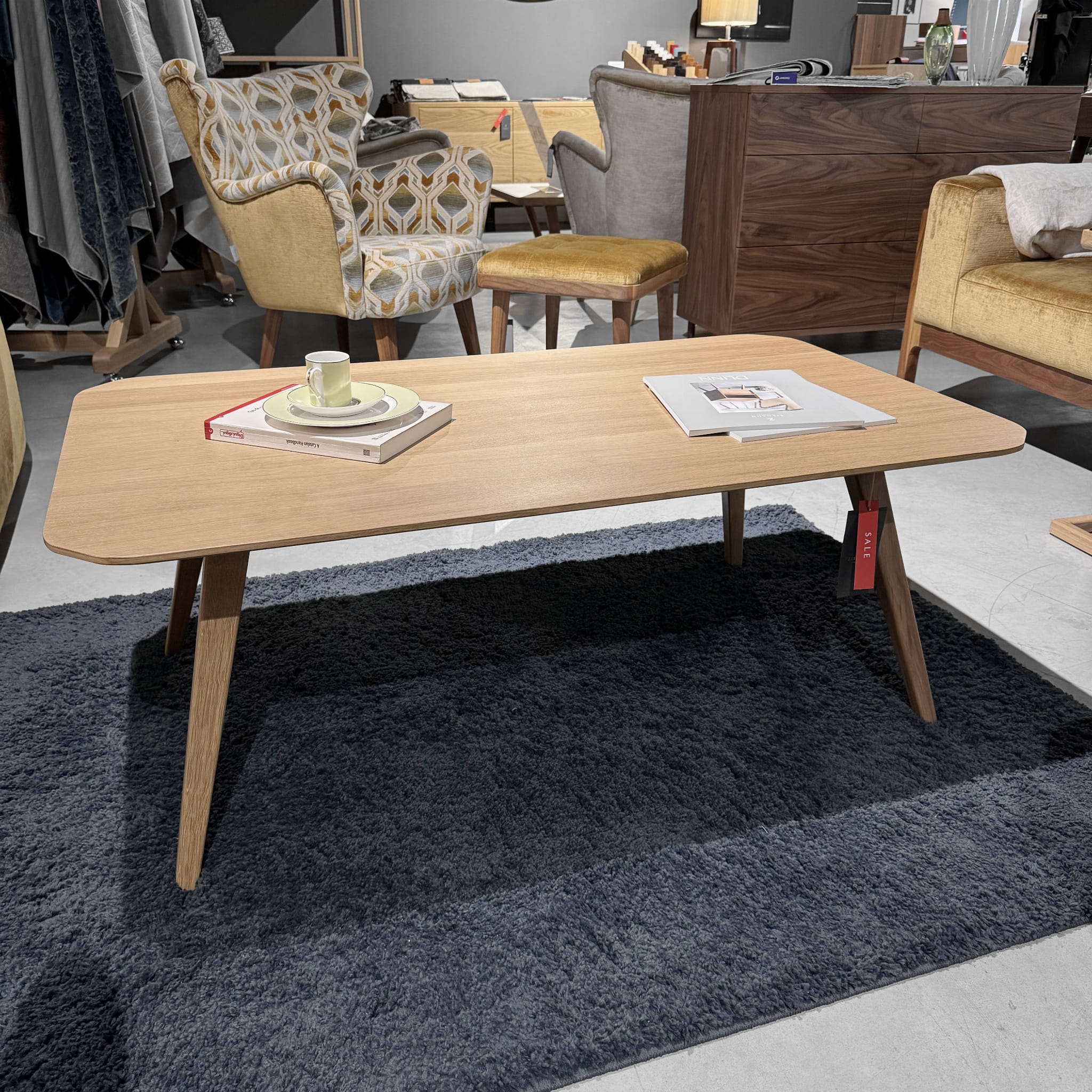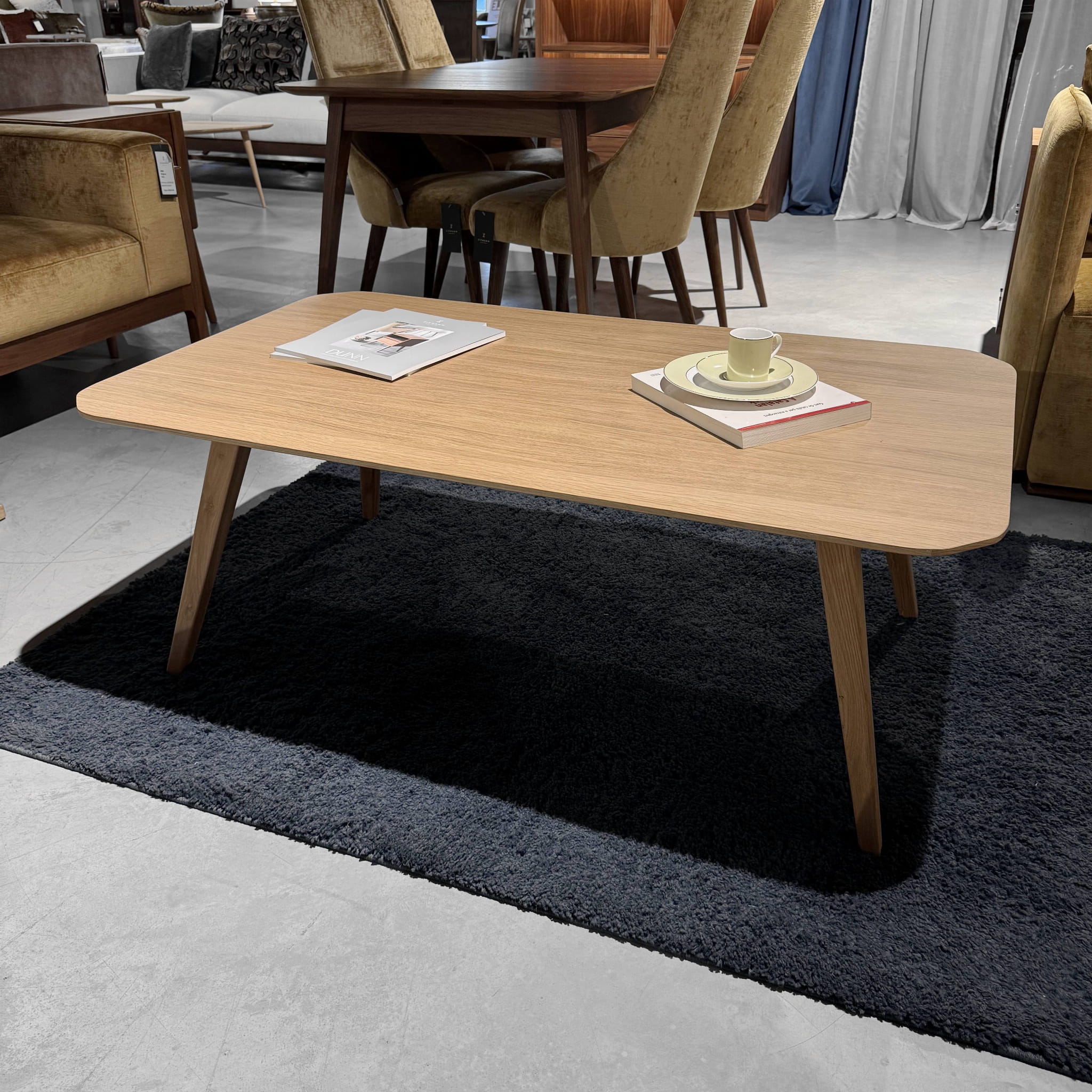 Mebel wyróżnia się geometrycznymi kształtami, ukośnymi nogami z litego drewna i ściętym pod skosem rantem blatu.