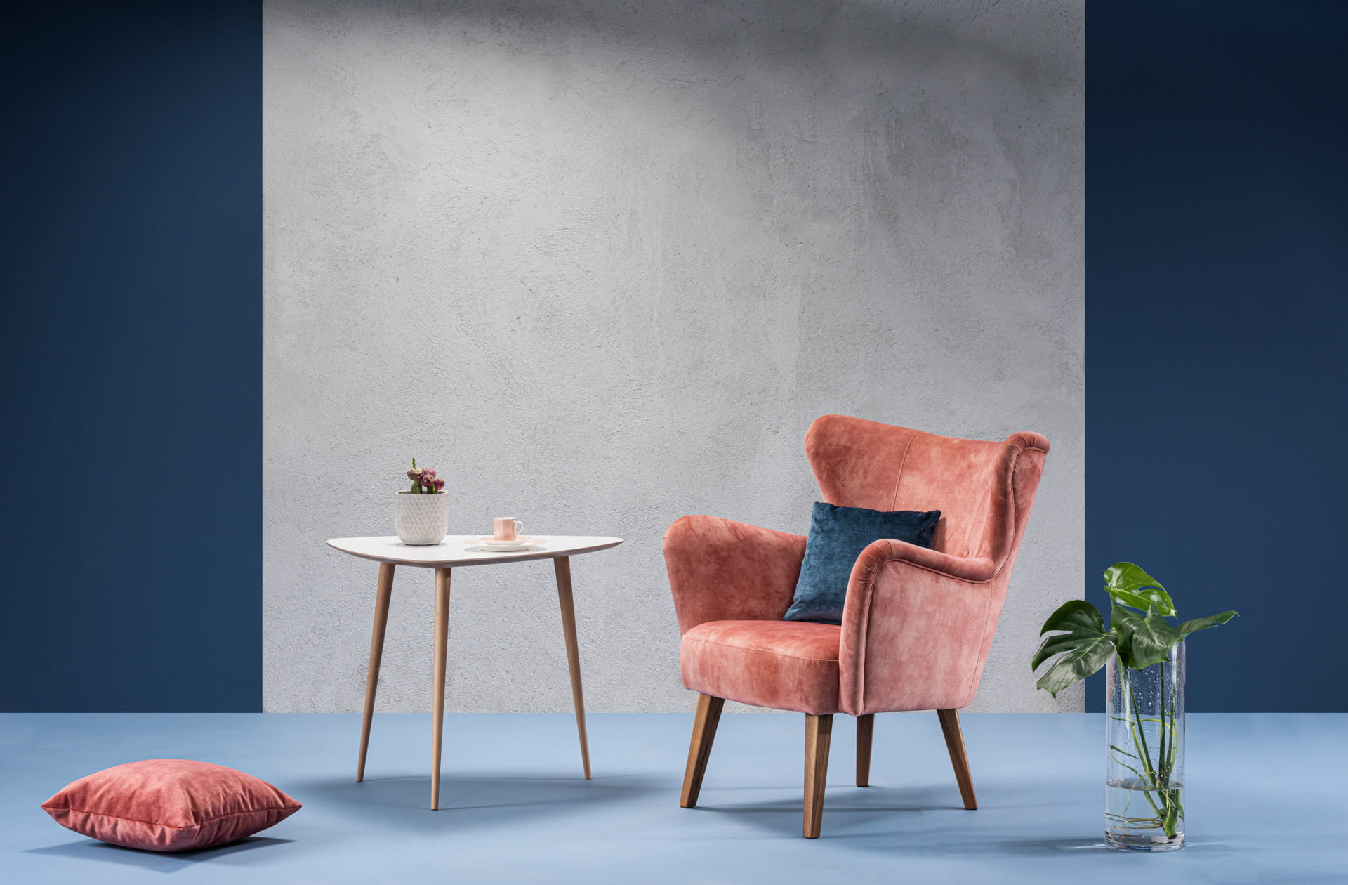 Mebel wyróżnia się geometrycznymi kształtami i ukośnymi, smukłymi nogami z litego drewna.