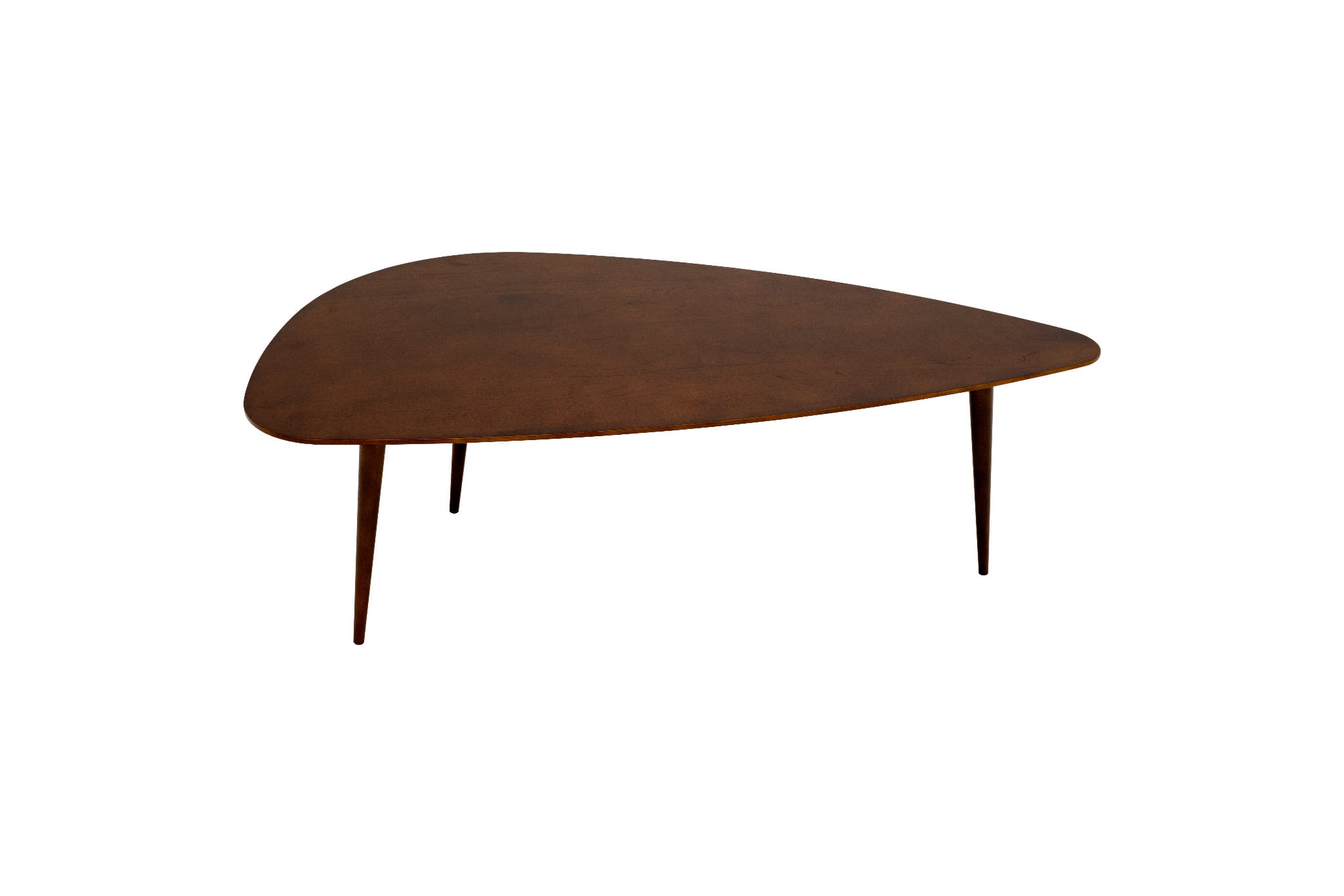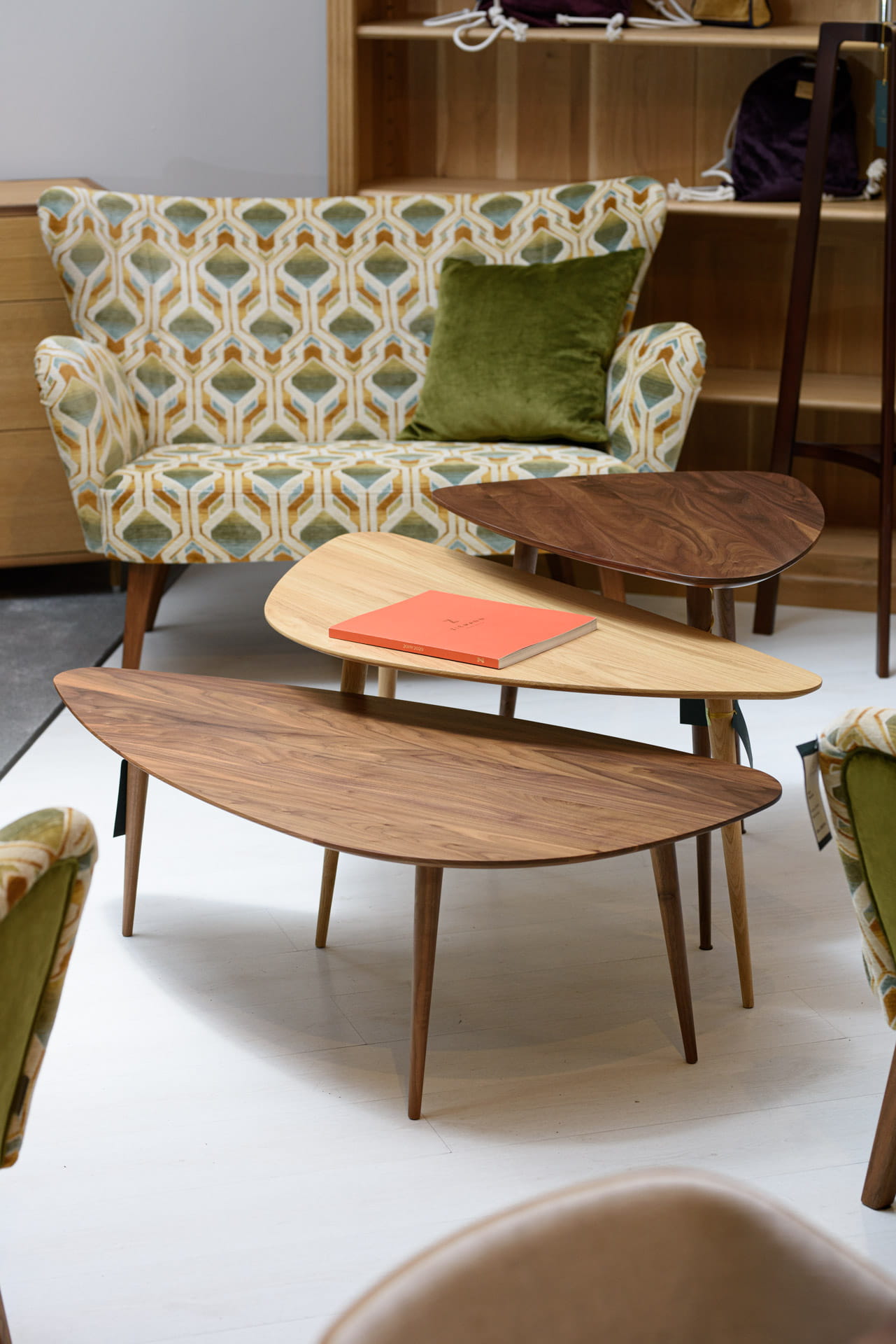 Minimalistyczne stoliki kawowe w stylu mebli skandynawskich z lat 60., wykonane w całości z drewna.