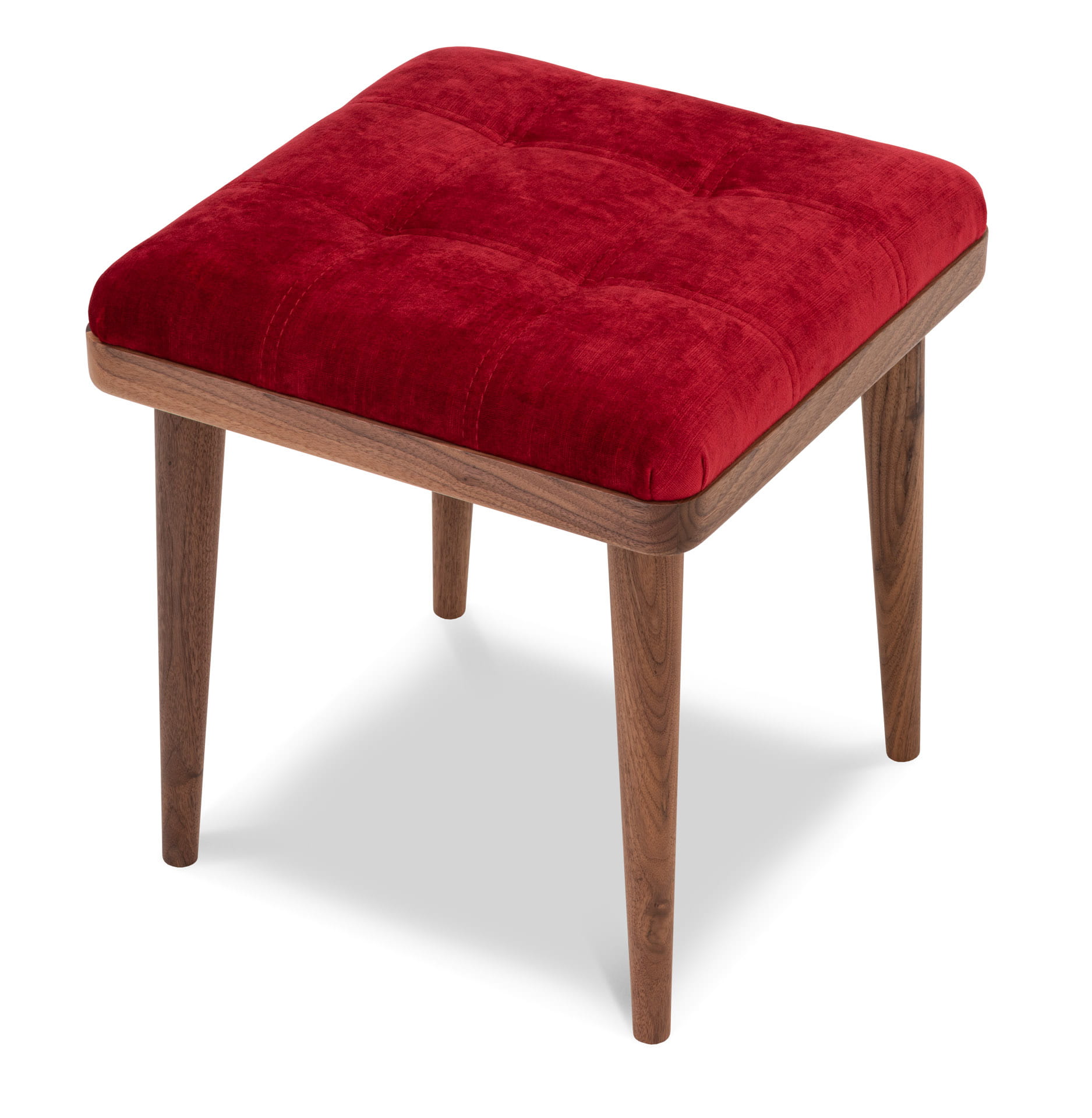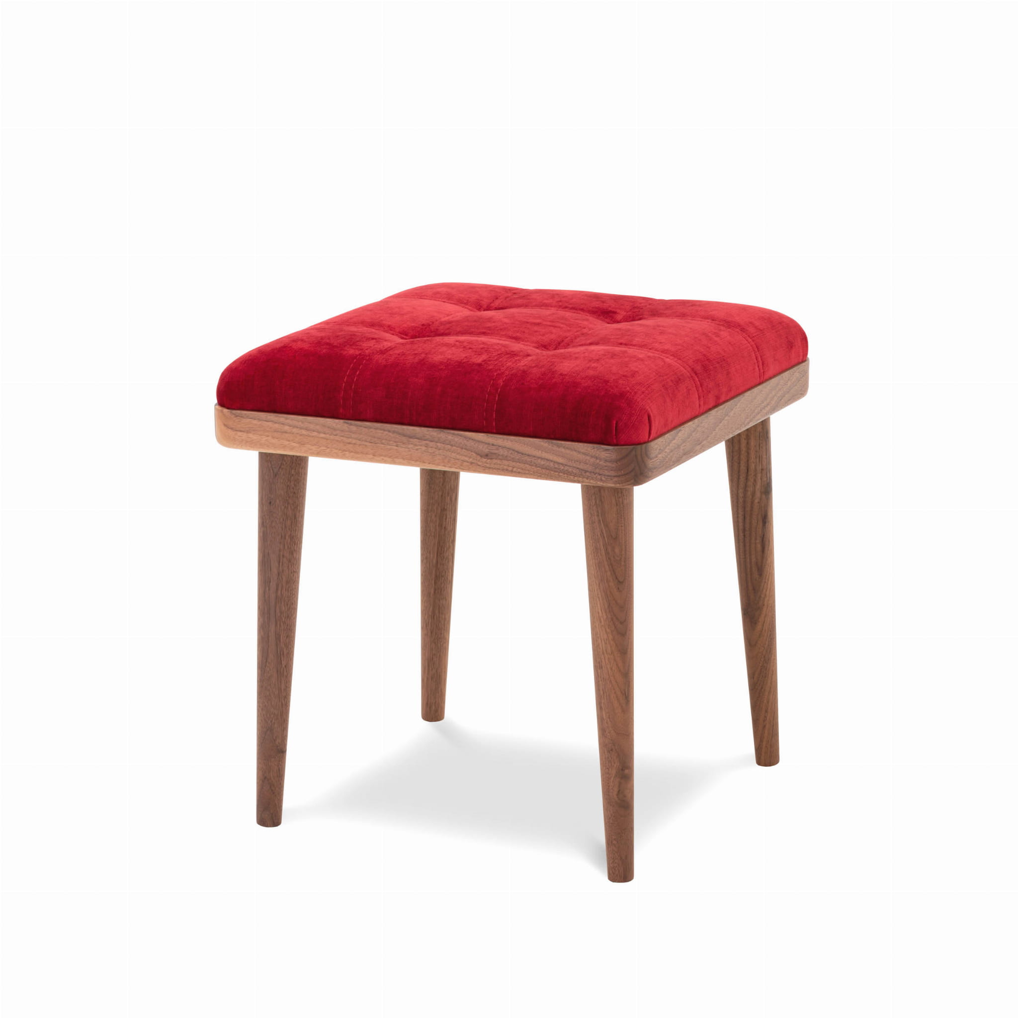 Tapicerowane siedzisko w stylistyce mebli skandynawskich z lekko ukośnymi, stożkowymi nogami z litego drewna.