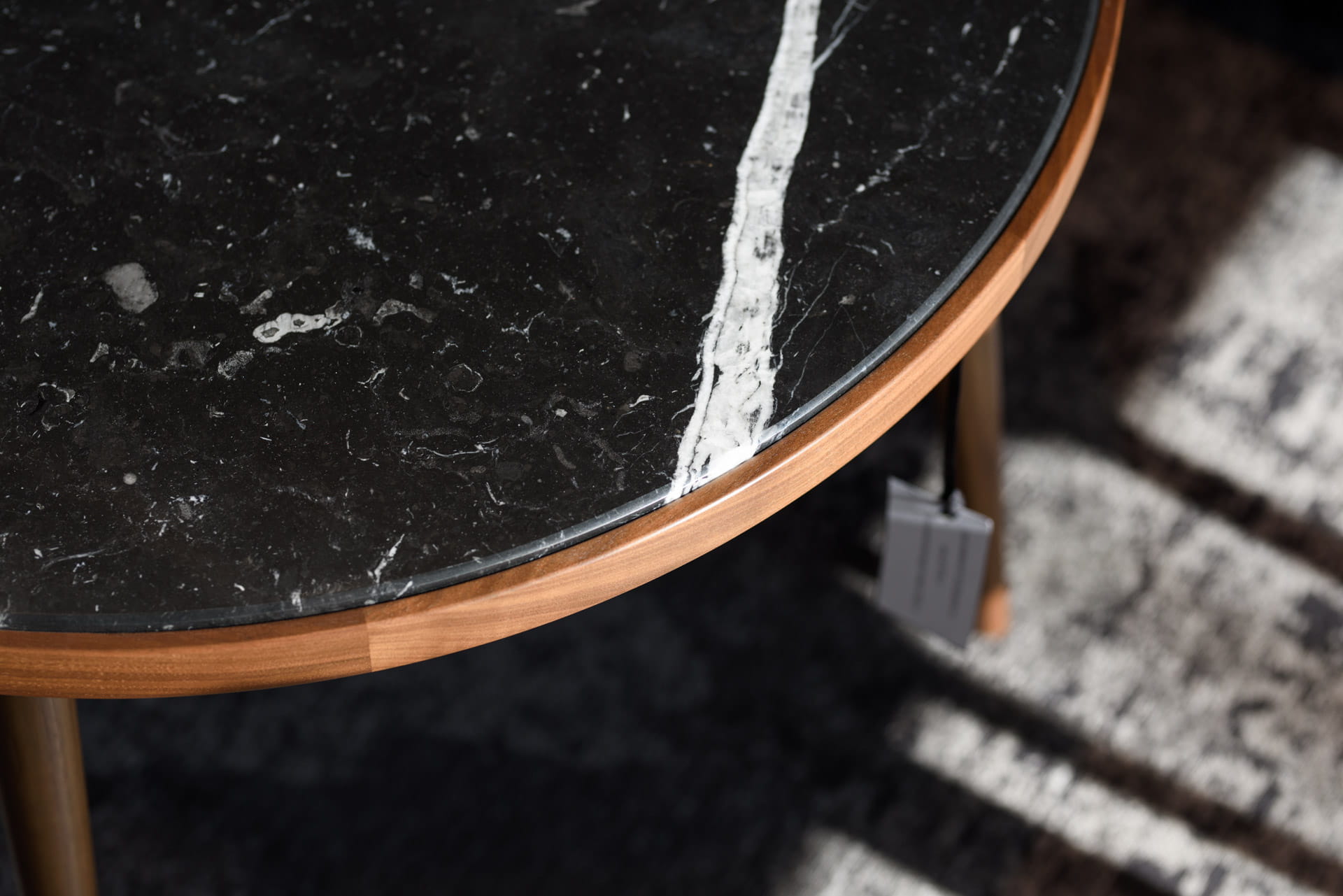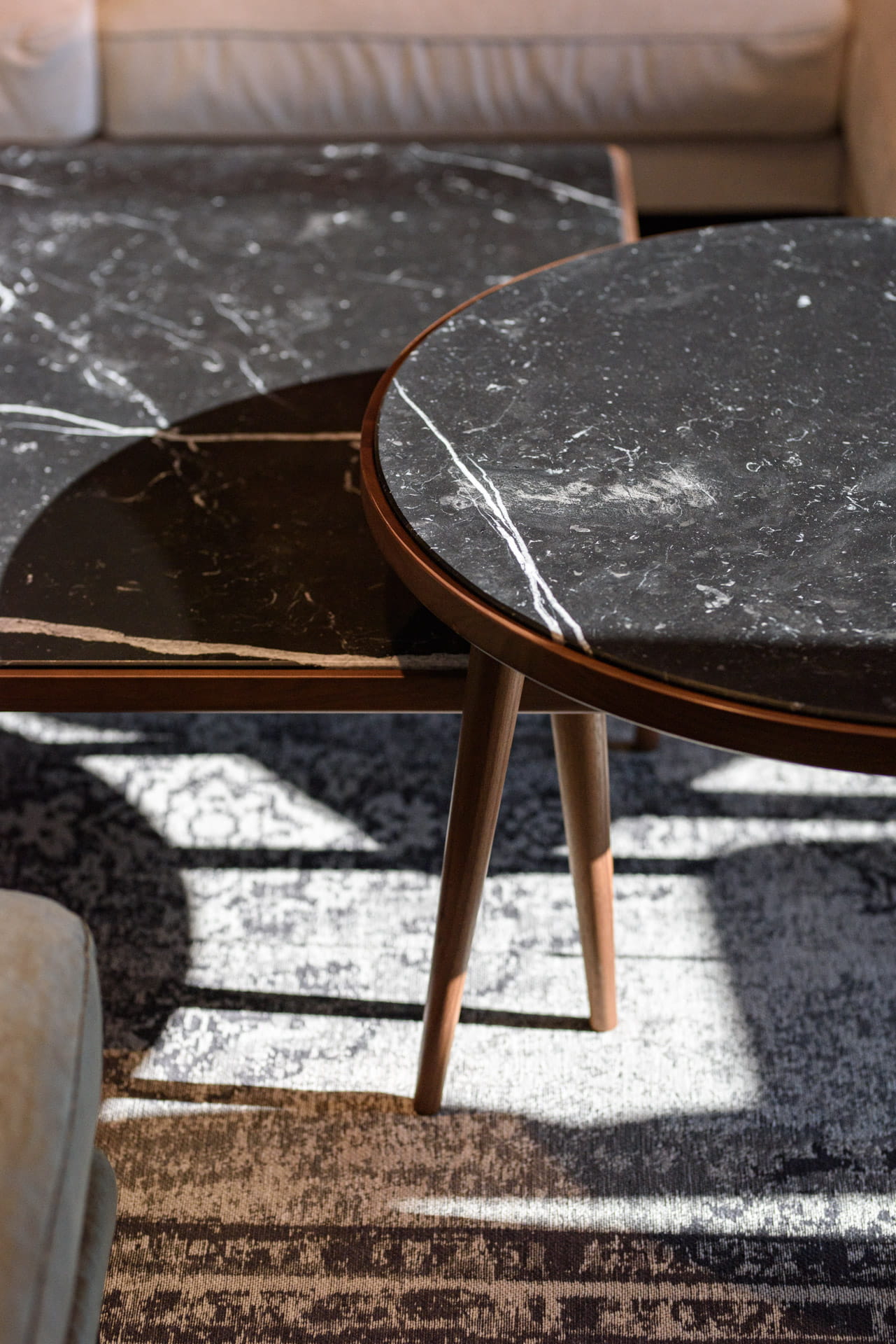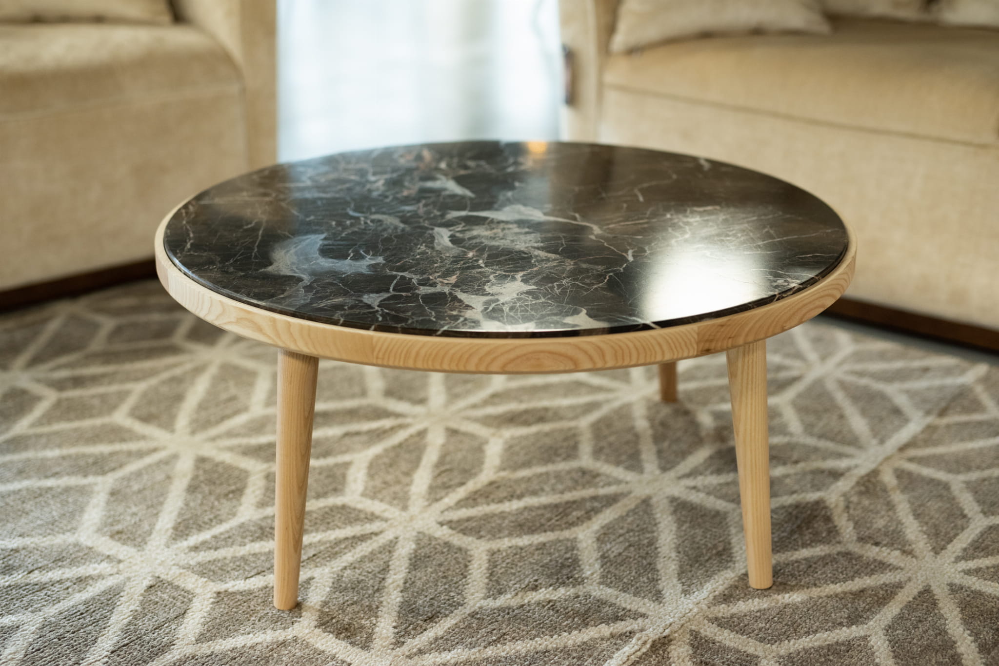 Blat stolika występuje w dwóch opcjach: marmurowej lub drewnianej.