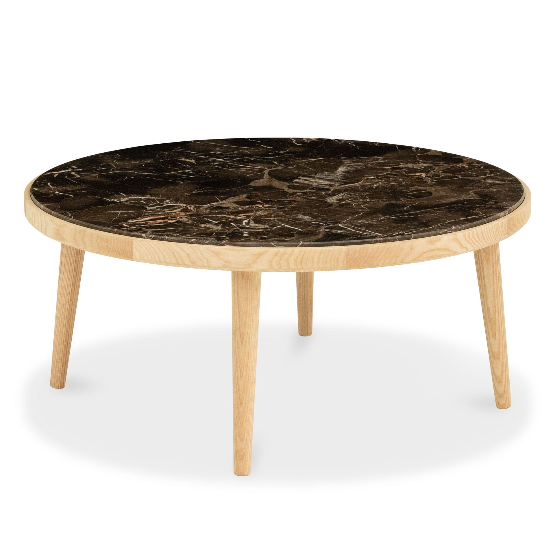 Okrągły, niski stolik kawowy w stylistyce mebli skandynawskich z lekko ukośnymi, stożkowymi nogami z litego drewna.